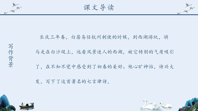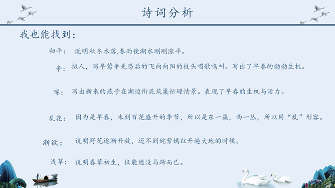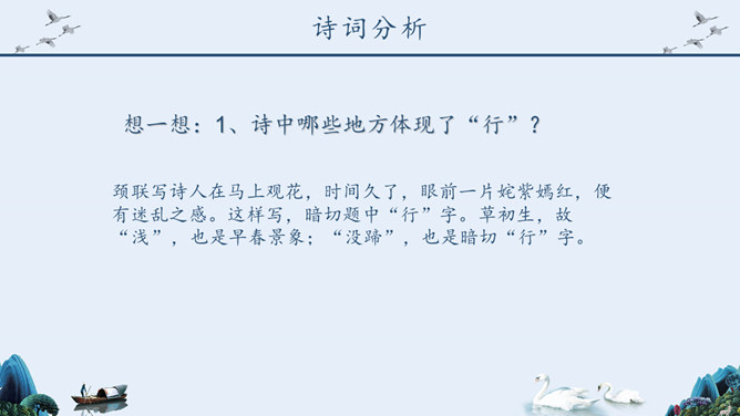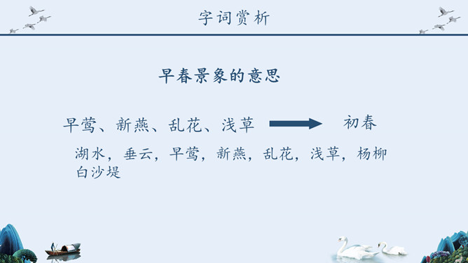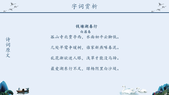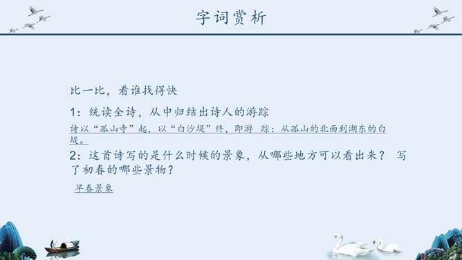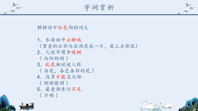 解释诗中红色词的词义:1、水面初平云脚低 (重叠的云彩与波澜连成一片,看上去很低)2、几处早莺争暖树 ( 向阳的树 )3、乱花渐欲迷人眼( 杂花,各色各样的花 )4、浅草才能没马蹄 ( 刚刚能够 )5、最爱湖东行不足( 不够 )。比一比,看谁找得快:1:统读全诗,从中归结出诗人的游踪 。2:这首诗写的是什么时候的景象,从哪些地方可以看出来? 写了初春的哪些景物?所属专题:钱塘湖春行ppt。
