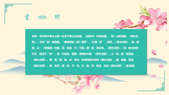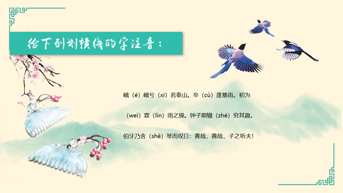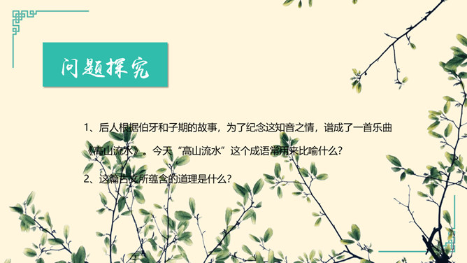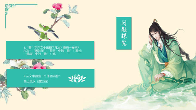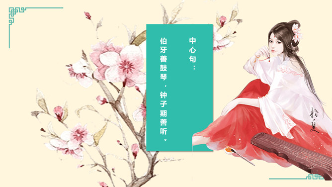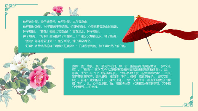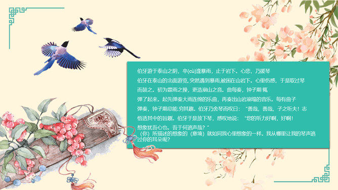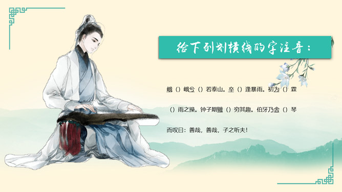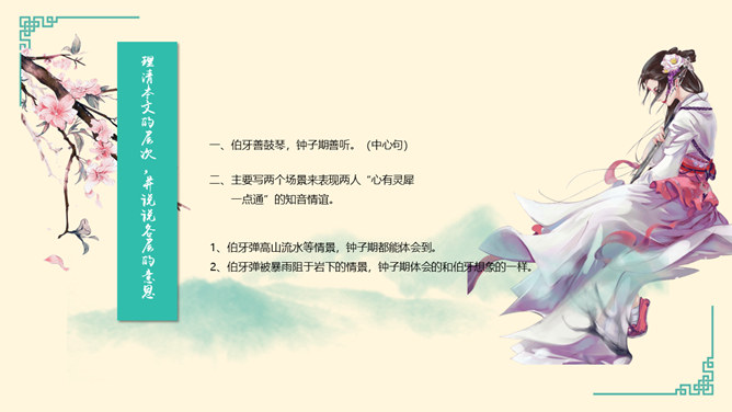 伯牙善鼓琴PPT课件。理清本文的层次,并说说各层的意思。一、伯牙善鼓琴,钟子期善听。(中心句)二、主要写两个场景来表现两人“心有灵犀 一点通”的知音情谊。1、伯牙弹高山流水等情景,钟子期都能体会到。2、伯牙弹被暴雨阻于岩下的情景,钟子期体会的和伯牙想象的一样。