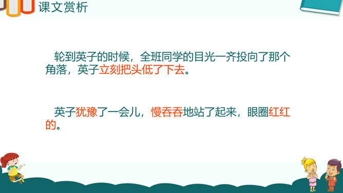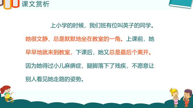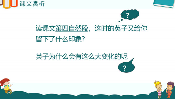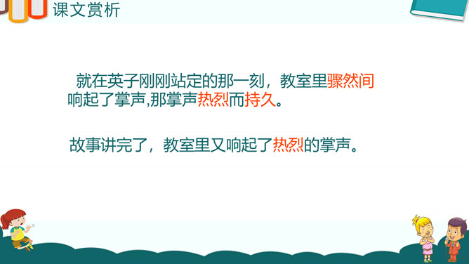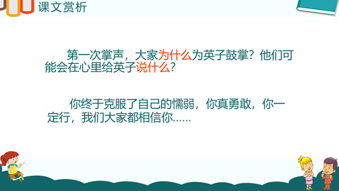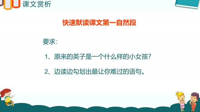 掌声PPT课件。快速默读课文第一自然段,要求:1、原来的英子是一个什么样的小女孩?2、边读边勾划出最让你难过的语句。同学们为什么给英子掌声?同学们的第一次掌声和第二次掌声有什么不同?
