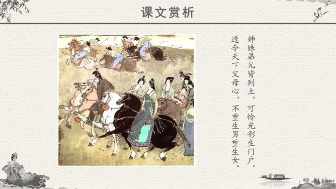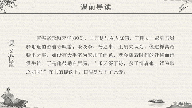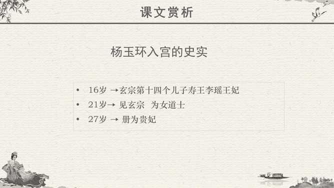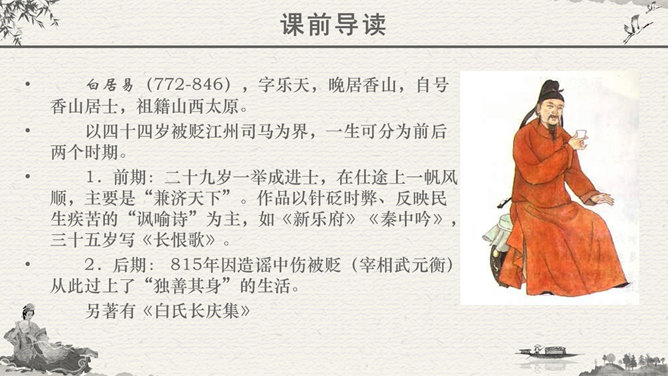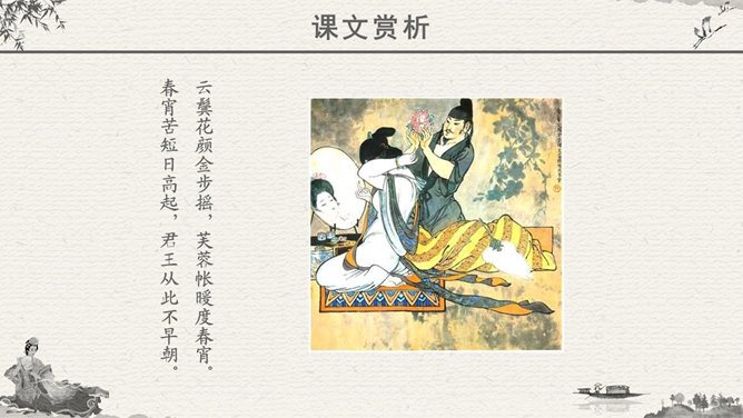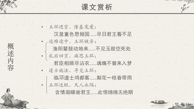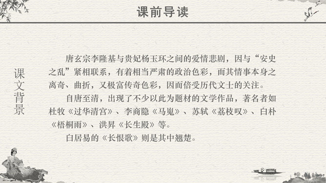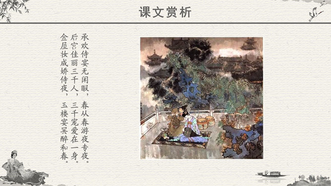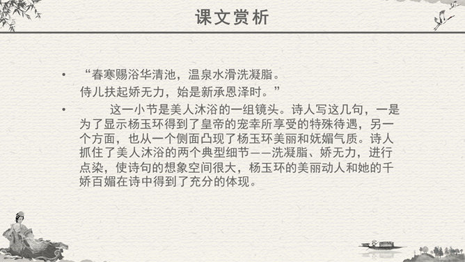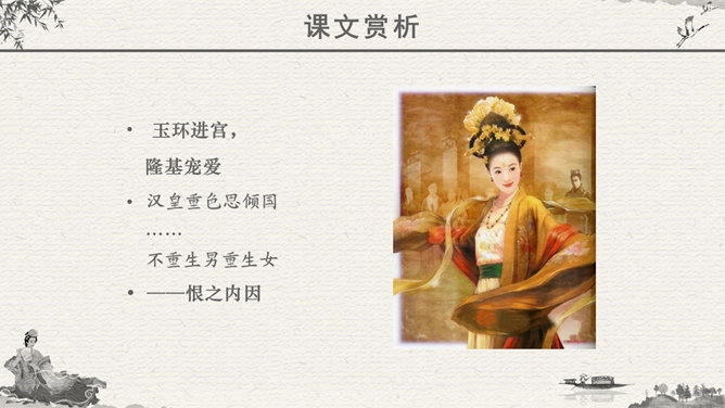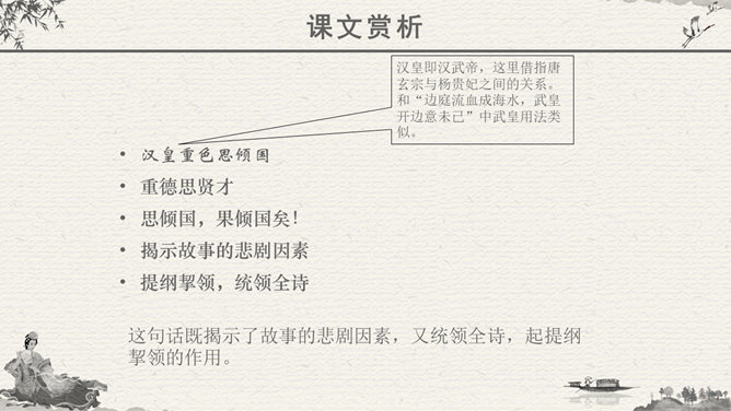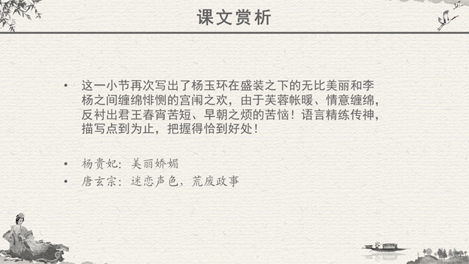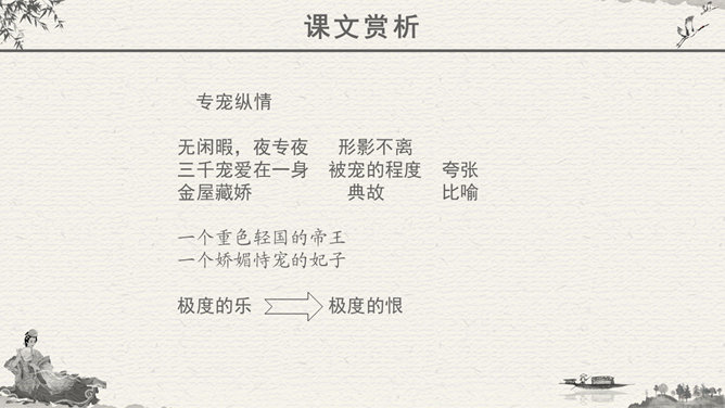 长恨歌PPT课件。哪一句集中描写了杨玉环的美貌?运用了什么手法?“回眸一笑百媚生,六宫粉黛无颜色。”运用夸张和对比的手法,反衬出杨玉环倾国倾城的美貌。讽喻主题通过对唐明皇和杨贵妃情爱的描写,对唐玄宗的荒淫误国进行了讽刺和暴露。爱情主题通过对李杨悲剧的描写,歌颂了他们真挚和专一的爱情。双重主题对李杨爱情悲剧的描写,既有讽刺批判,又有同情歌颂。