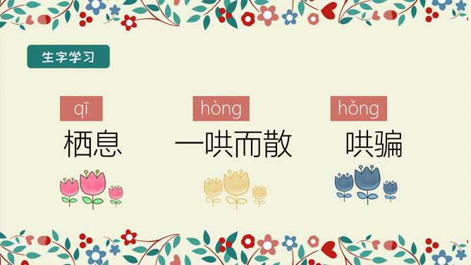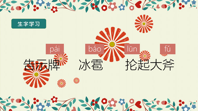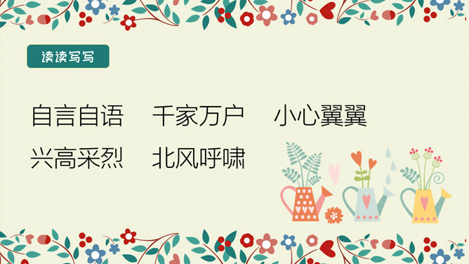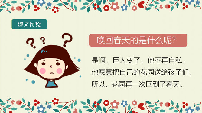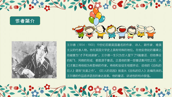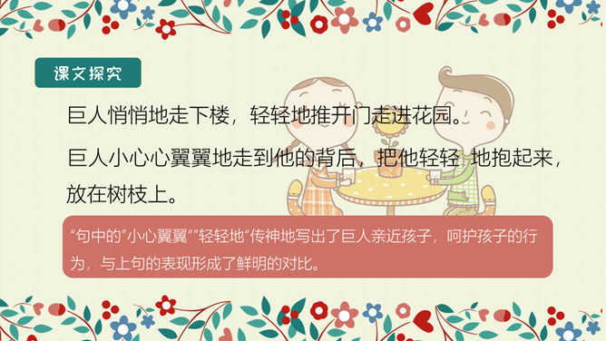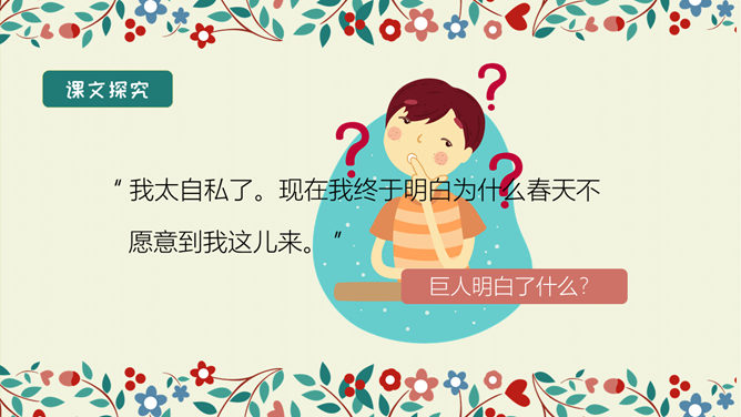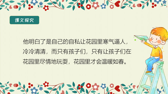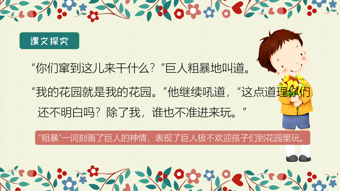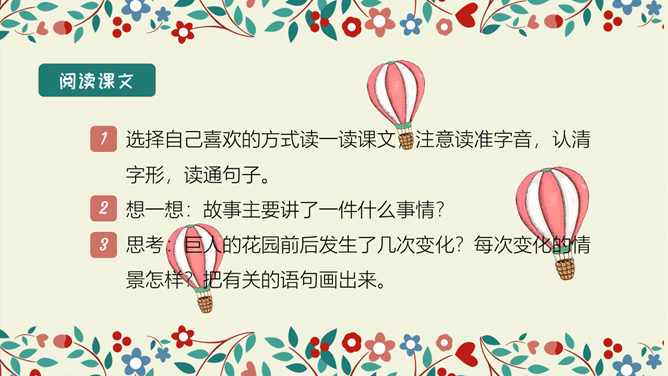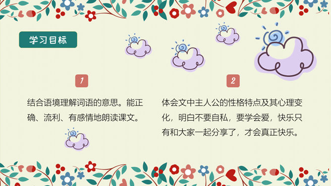 学习目标:结合语境理解词语的意思。能正确、流利、有感情地朗读课文。 体会文中主人公的性格特点及其心理变化,明白不要自私,要学会爱,快乐只有和大家一起分享了,才会真正快乐。选择自己喜欢的方式读一读课文,注意读准字音,认清字形,读通句子。想一想:故事主要讲了一件什么事情?思考:巨人的花园前后发生了几次变化?每次变化的情景怎样?把有关的语句画出来。所属专题:巨人的花园ppt。