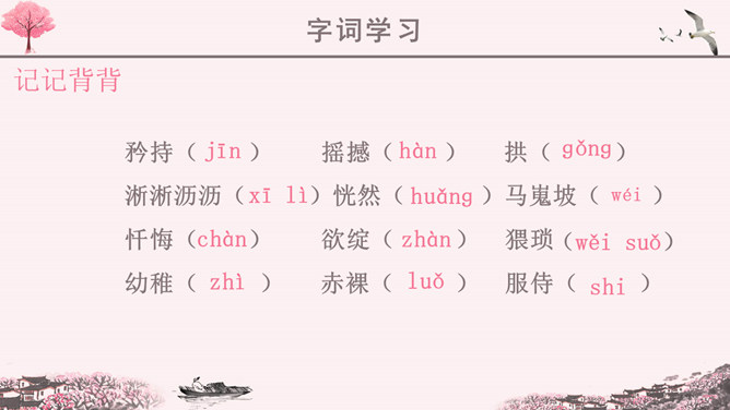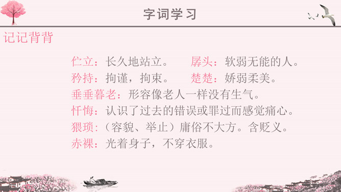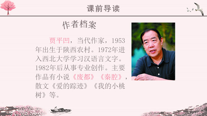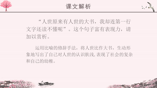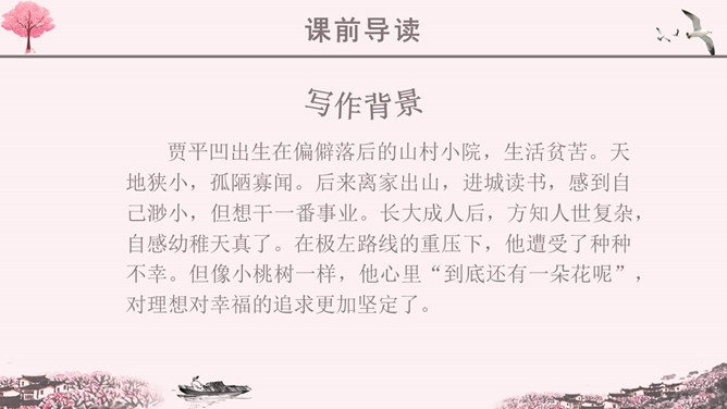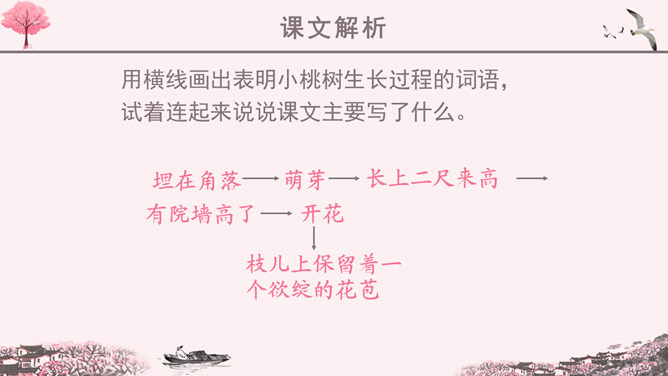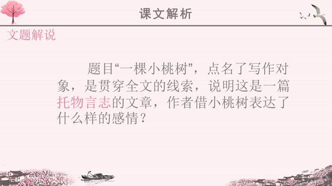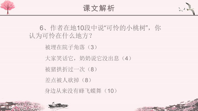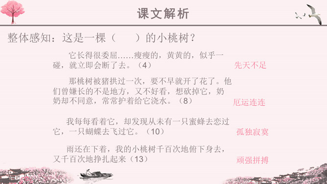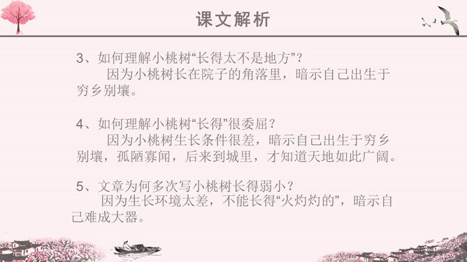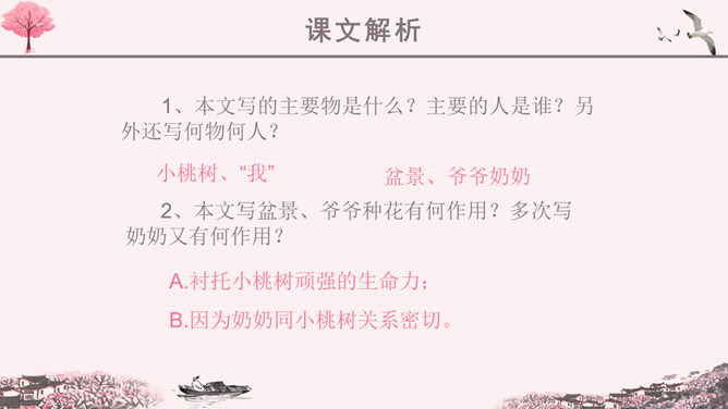 本文写的主要物是什么?主要的人是谁?另外还写何物何人?小桃树、“我”。盆景、爷爷奶奶。本文写盆景、爷爷种花有何作用?多次写奶奶又有何作用?A.衬托小桃树顽强的生命力;B.因为奶奶同小桃树关系密切。如何理解小桃树“长得太不是地方”?因为小桃树长在院子的角落里,暗示自己出生于穷乡别壤。如何理解小桃树“长得”很委屈?因为小桃树生长条件很差,暗示自己出生于穷乡别壤,孤陋寡闻,后来到城里,才知道天地如此广阔。所属专题:一颗小桃树ppt。