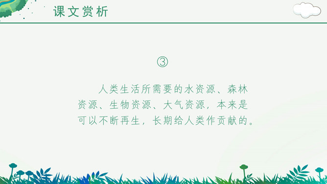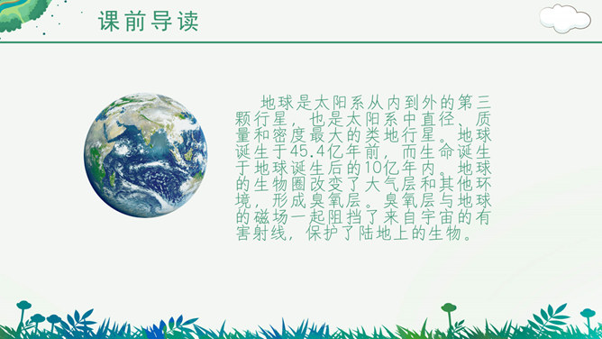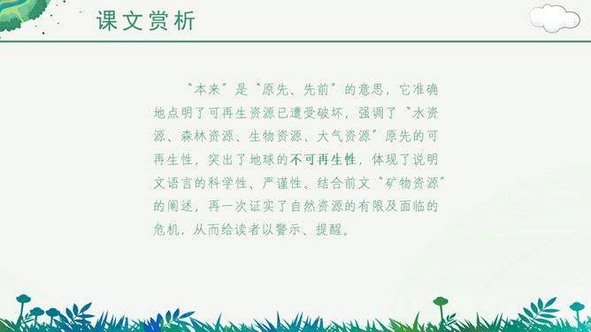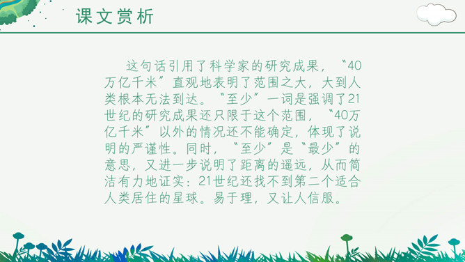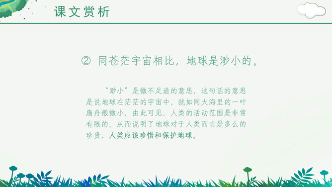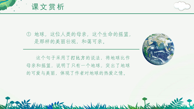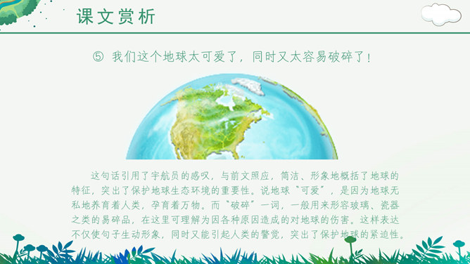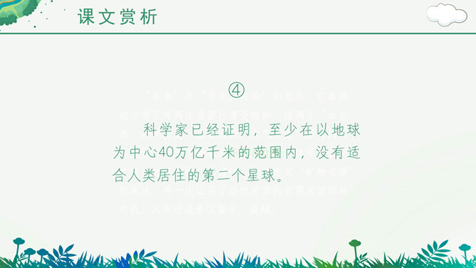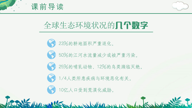 全球生态环境状况的几个数字,23%的耕地面积严重退化。50%的江河水流量减少或被严重污染。25%的哺乳动物、12%的鸟类濒临灭绝。1/4人类所患疾病与环境恶化有关。10亿人口受到荒漠化威胁。地球,这位人类的母亲,这个生命的摇篮,是那样的美丽壮观,和蔼可亲。这个句子采用了打比方的说法,将地球比作母亲和摇篮,说明了只有一个地球,突出了地球的可爱与美丽,体现了作者对地球的热爱之情。所属专题:只有一个地球ppt。