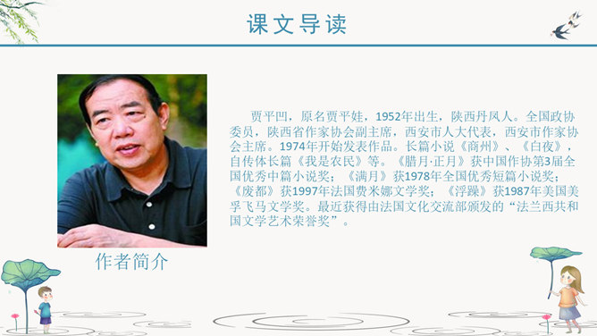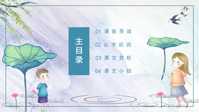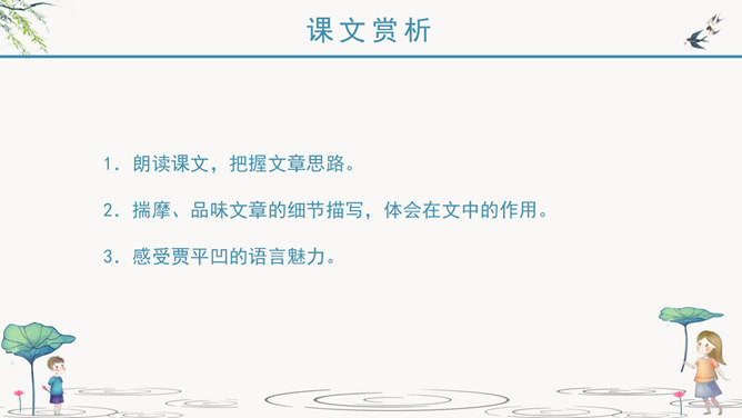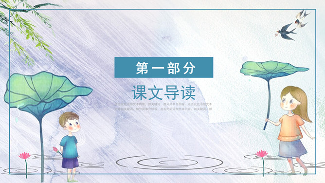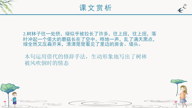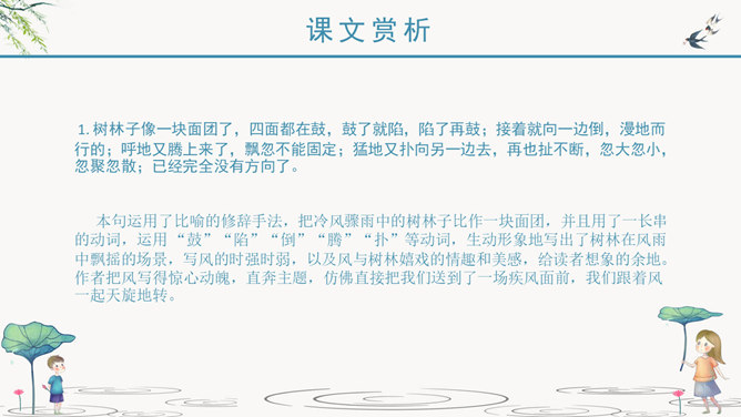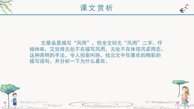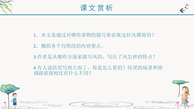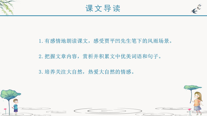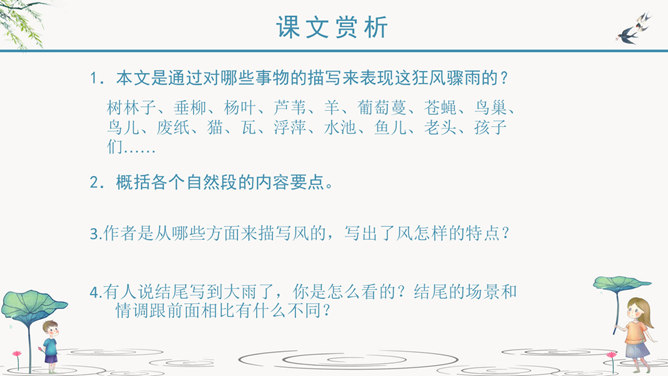 风雨PPT课件。1.有感情地朗读课文,感受贾平凹先生笔下的风雨场景。2.把握文章内容,赏析并积累文中优美词语和句子。3.培养关注大自然,热爱大自然的情感。课文赏析:1.朗读课文,把握文章思路。2.揣摩、品味文章的细节描写,体会在文中的作用。3.感受贾平凹的语言魅力。课文赏析:1.本文是通过对哪些事物的描写来表现这狂风骤雨的?2.概括各个自然段的内容要点。3.作者是从哪些方面来描写风的,写出了风怎样的特点?4.有人说结尾写到大雨了,你是怎么看的?结尾的场景和情调跟前面相比有什么不同?