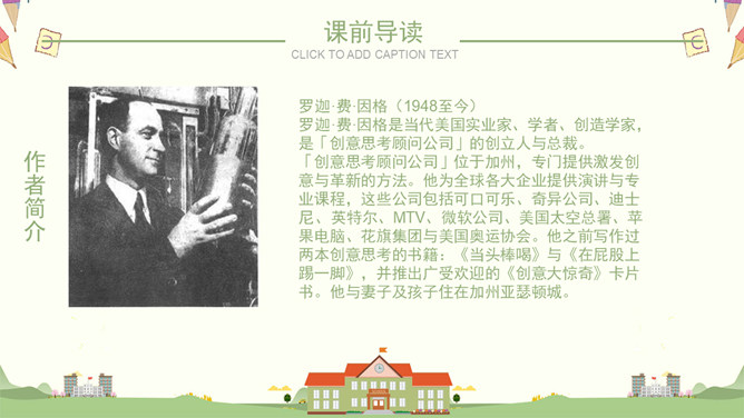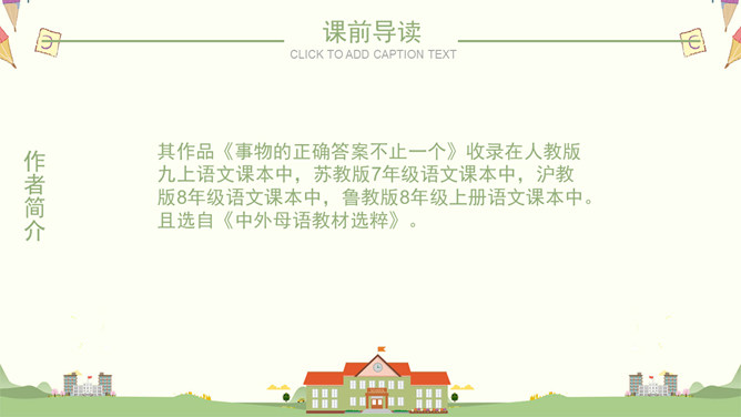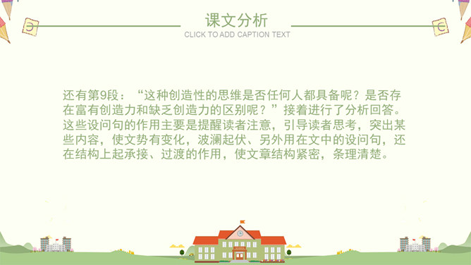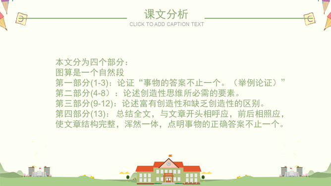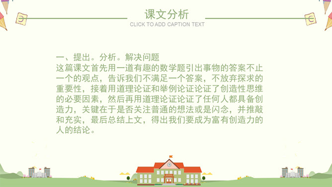 事物的正确答案不止一个PPT课件。课文分析:一、提出。分析。解决问题这篇课文首先用一道有趣的数学题引出事物的答案不止一个的观点,告诉我们不满足一个答案,不放弃探求的重要性,接着用道理论证和举例论证论证了创造性思维的必要因素,然后再用道理论证论证了任何人都具备创造力,关键在于是否关注普通的想法或是闪念,并推敲和充实,最后总结上文,得出我们要成为富有创造力的人的结论。