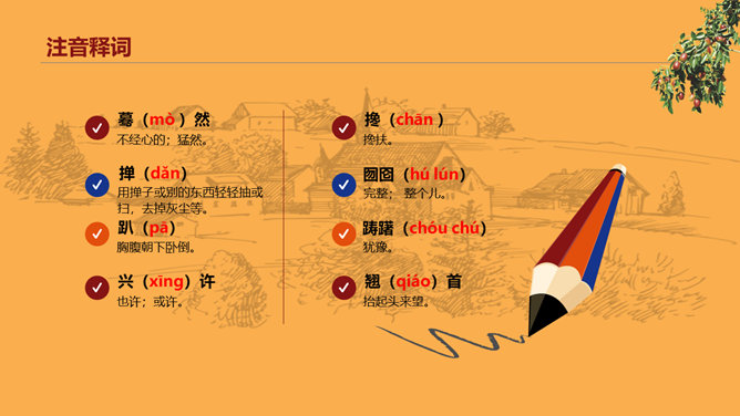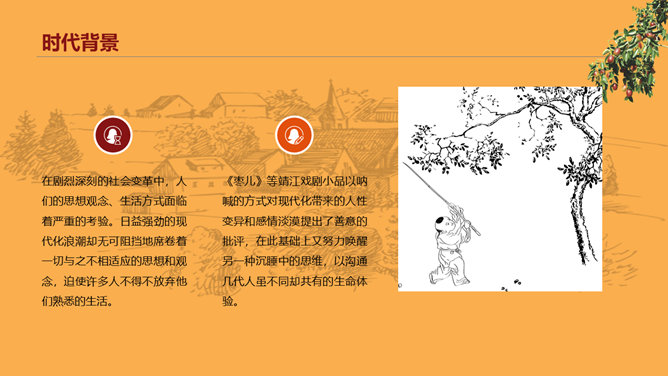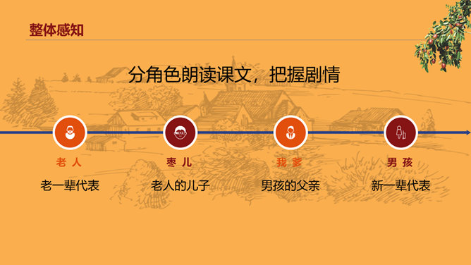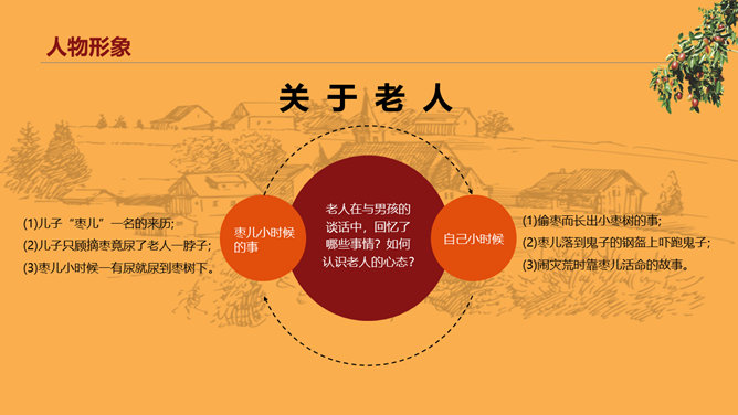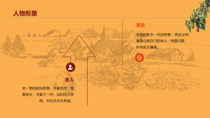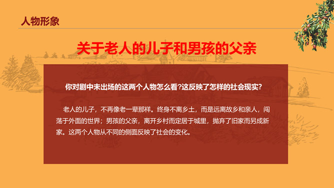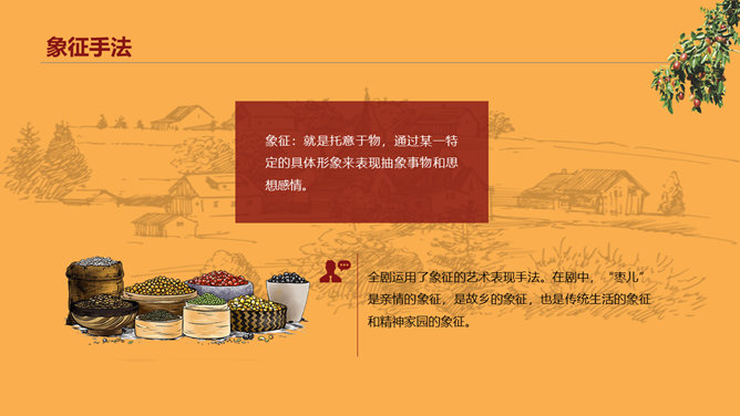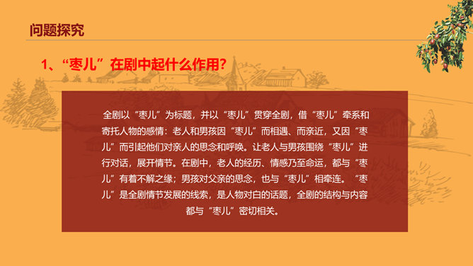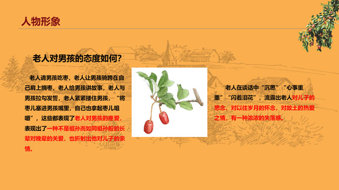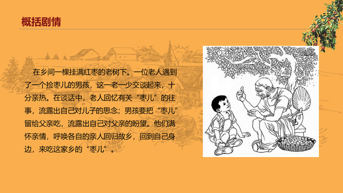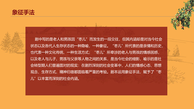 象征:就是托意于物,通过某一特定的具体形象来表现抽象事物和思想感情。全剧运用了象征的艺术表现手法。在剧中,“枣儿”是亲情的象征,是故乡的象征,也是传统生活的象征和精神家园的象征。老人请男孩吃枣,老人让男孩骑跨在自己肩上摘枣,老人给男孩讲故事,老人与男孩拉勾发誓,老人紧紧搂住男孩,“将枣儿塞进男孩嘴里,自己也拿起枣儿咀嚼”,这些都表现了老人对男孩的疼爱,表现出了一种不是祖孙而如同祖孙般的长辈对晚辈的关爱,也折射出他对儿子的亲情。所属专题:枣儿ppt。