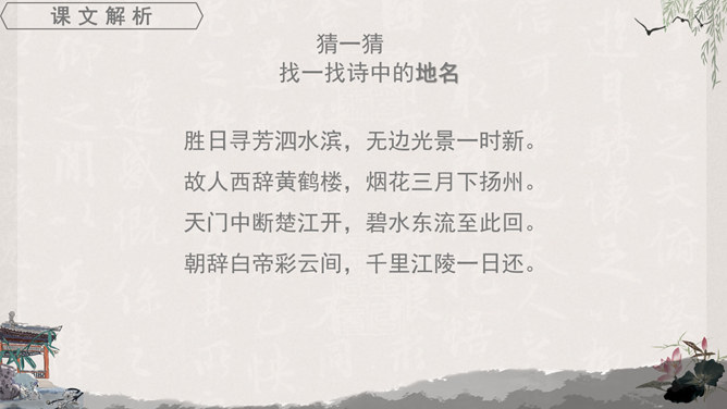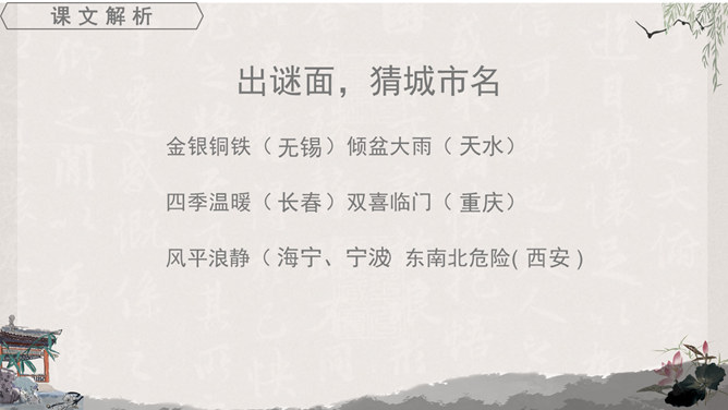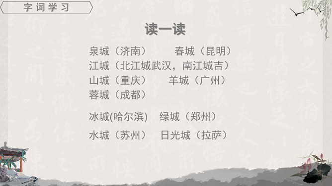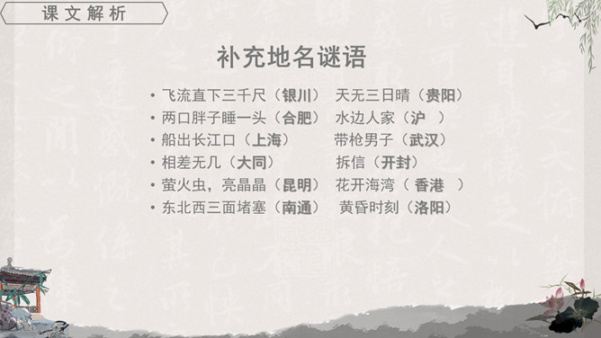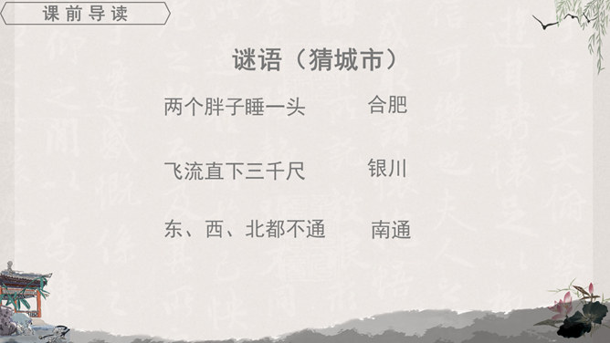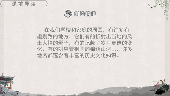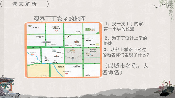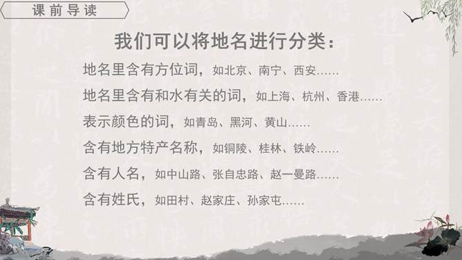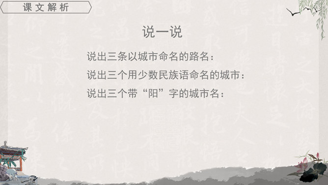 地名PPT课件。在我们学校和家庭的周围,有许多有趣别致的地方,它们有的折射出当地的风土人情的影子,有的记载了岁月更迭的变化,有的对应着祖国的锦绣山河……许多地名都蕴含着丰富的历史文化知识。说出三条以城市命名的路名:说出三个用少数民族语命名的城市:说出三个带“阳”字的城市名。