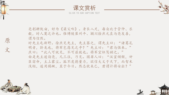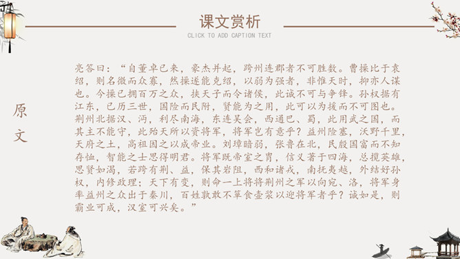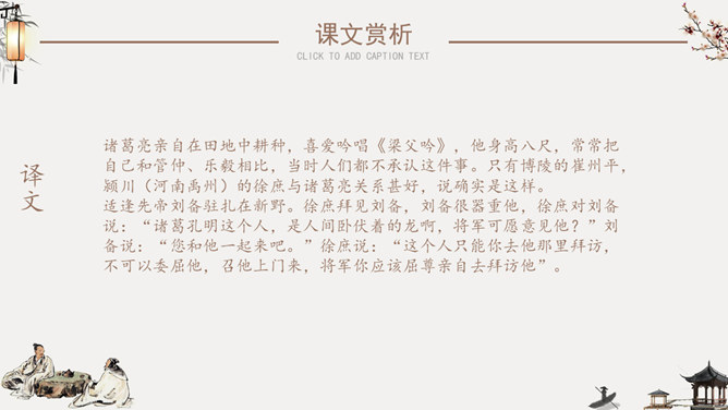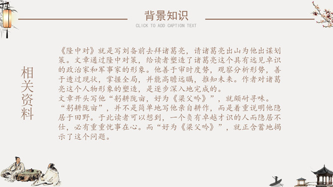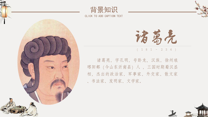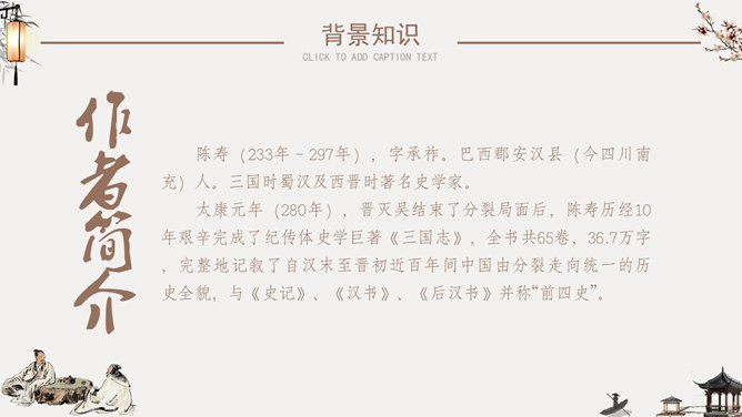 隆中对PPT课件。陈寿(233年-297年),字承祚。巴西郡安汉县(今四川南充)人。三国时蜀汉及西晋时著名史学家。诸葛亮,字孔明,号卧龙,汉族,徐州琅琊阳都(今山东沂南县)人 ,三国时期蜀汉丞相,杰出的政治家、军事家、外交家、散文家、书法家、发明家、文学家。成语知多少:箪食壶浆、如鱼得水、度德量力、三顾茅庐、挟天子以令诸侯。