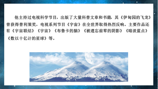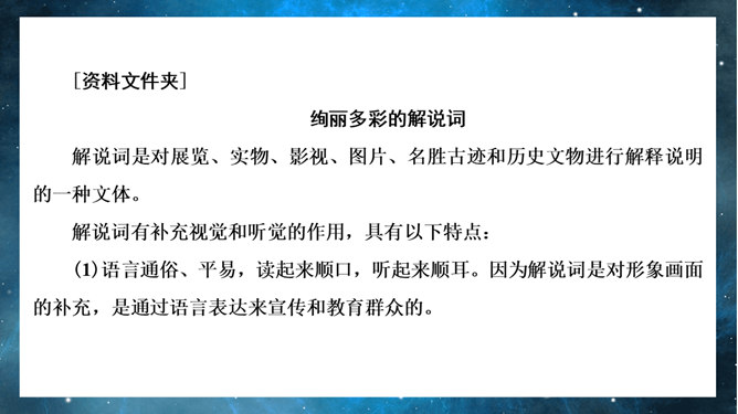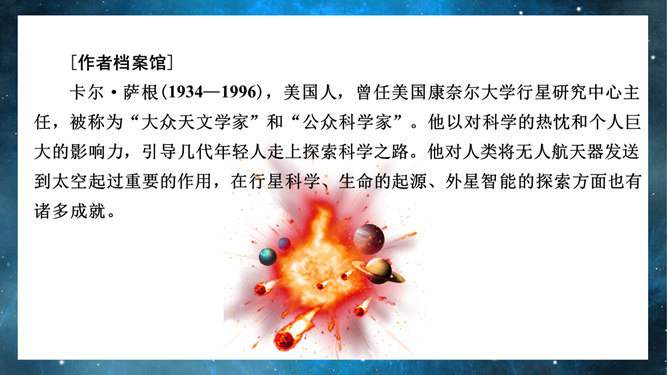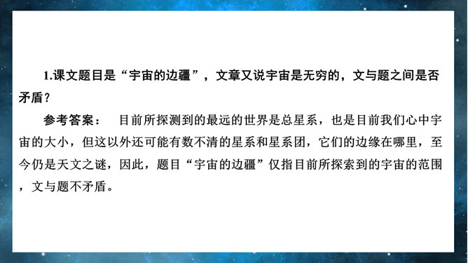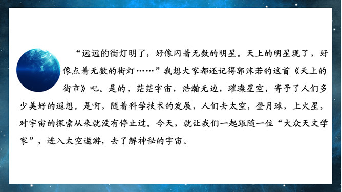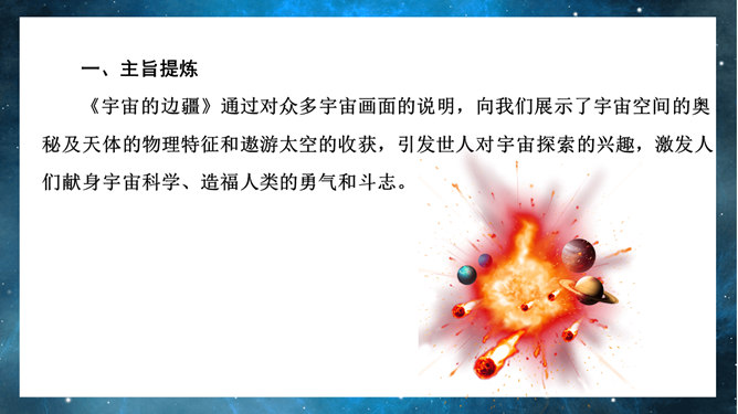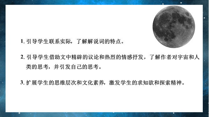 宇宙的边疆PPT课件。引导学生联系实际,了解解说词的特点。引导学生借助文中精辟的议论和热烈的情感抒发,了解作者对宇宙和人类的思考,并引发自己的思考。引导学生借助文中精辟的议论和热烈的情感抒发,了解作者对宇宙和人类的思考,并引发自己的思考。扩展学生的思维层次和文化素养,激发学生的求知欲和探索精神。