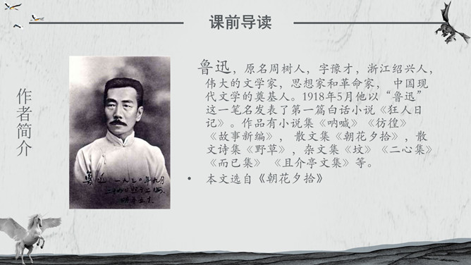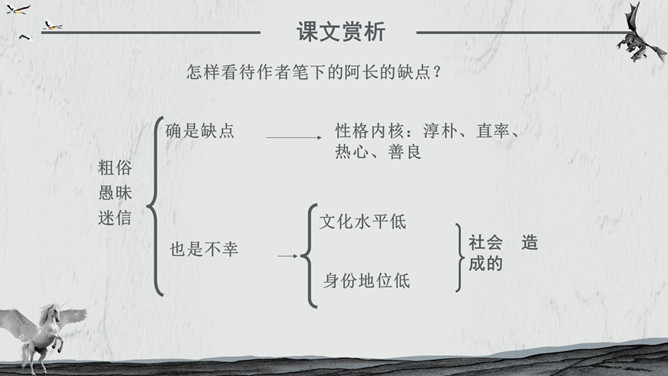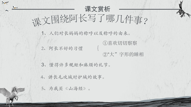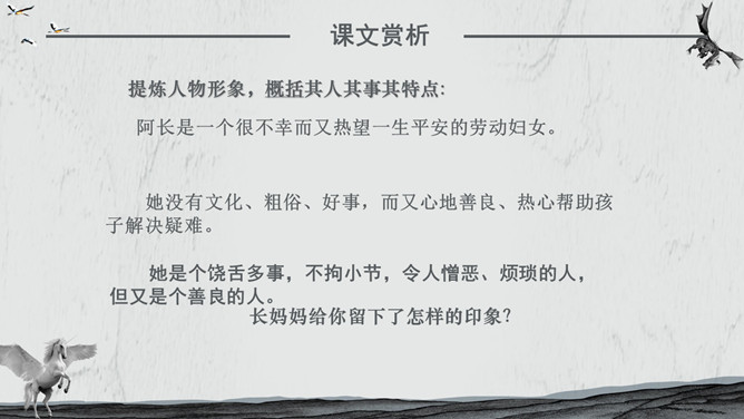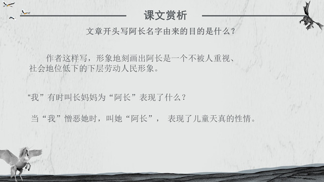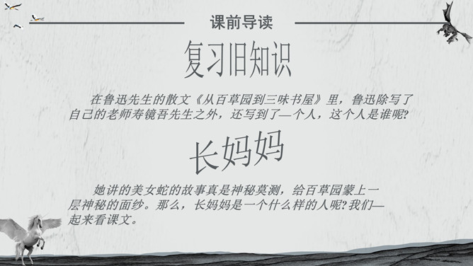 在鲁迅先生的散文《从百草园到三味书屋》里,鲁迅除写了自己的老师寿镜吾先生之外,还写到了—个人,这个人是谁呢? 她讲的美女蛇的故事真是神秘莫测,给百草园蒙上一层神秘的面纱。那么,长妈妈是一个什么样的人呢?我们—起来看课文。文章开头写阿长名字由来的目的是什么?作者这样写,形象地刻画出阿长是一个不被人重视、社会地位低下的下层劳动人民形象。所属专题:阿长与山海经ppt。