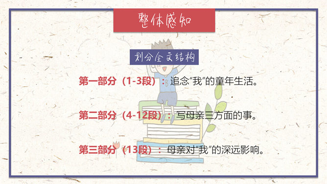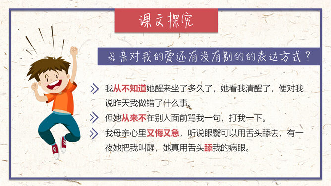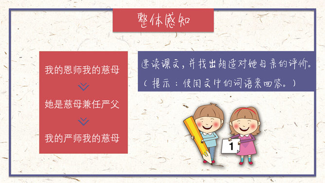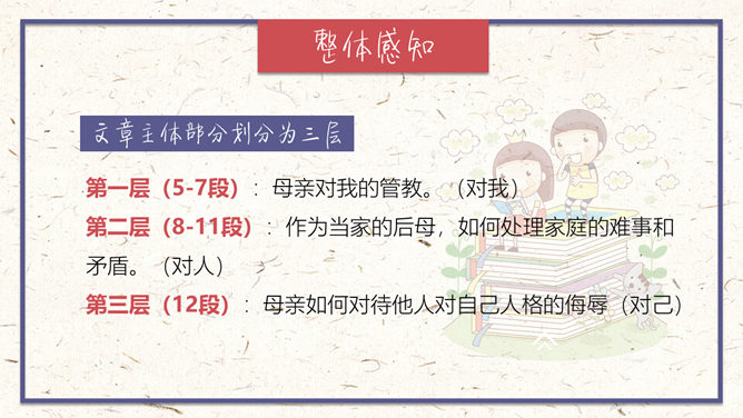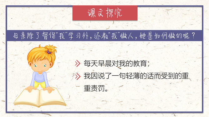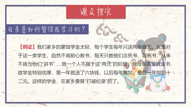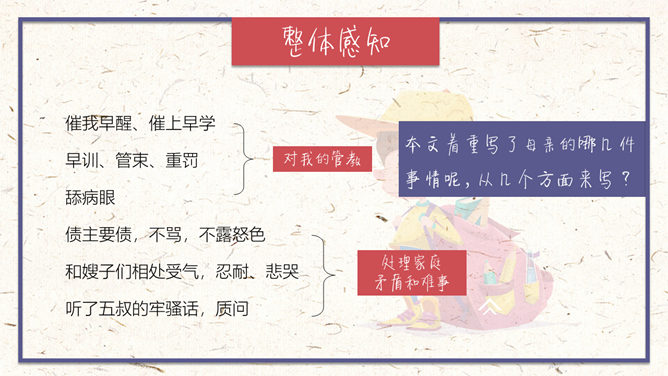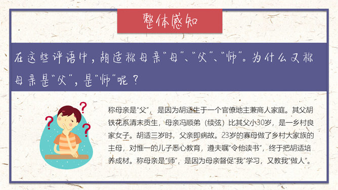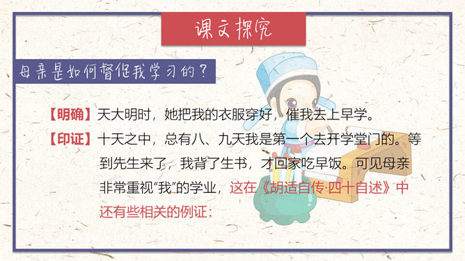 在母亲这痛苦的生活中,胡适看到了母亲身上的优秀品质——宽容、善良、容忍、温和而又“刚气”。在潜移默化中,母亲教会了胡适该怎么做人。那么,胡适是如何评价母亲对自己的影响的呢?【明确】如果我学得了一丝一毫的好脾气,如果我学得了一点点待人接物的和气,如果我能宽恕人,体谅人——我都得感谢我的慈母。【总结】母亲让胡适养成了宽容、善良、体谅的品性。有人认为1-4段写“我”的童年生活的缺憾,正是为了体现母亲给“我”做人的训练的珍贵,更突出对母亲的感激之情。也有人认为1-4段隐含着胡适对母亲的些许不满。你怎么认为?请到字里行间找依据。