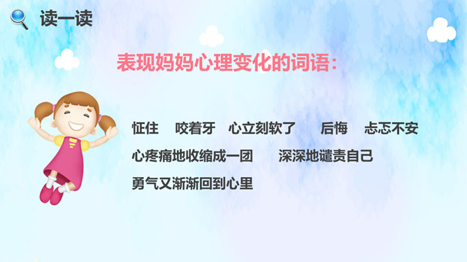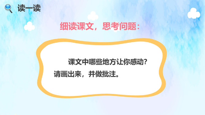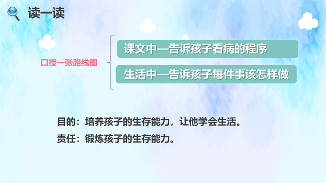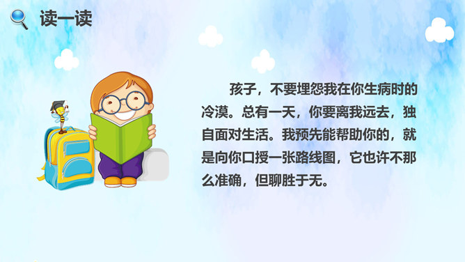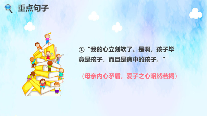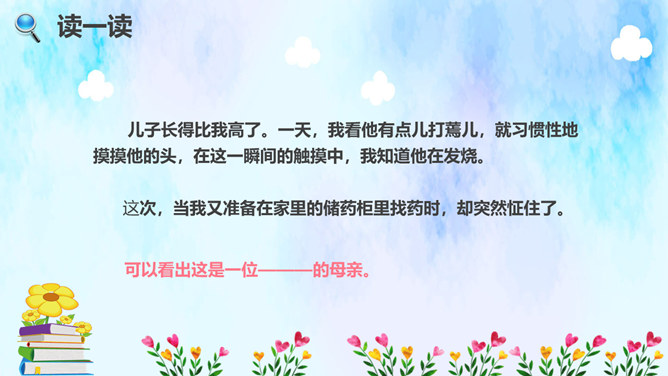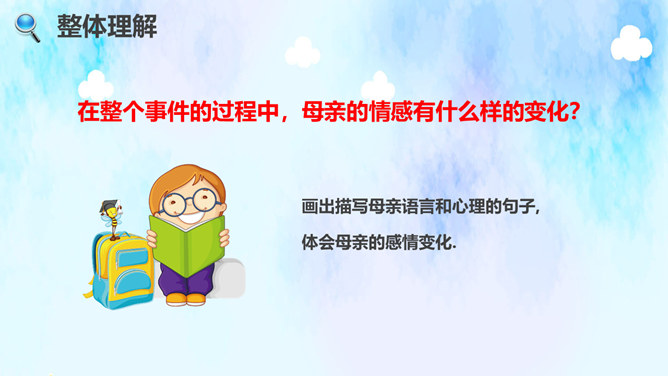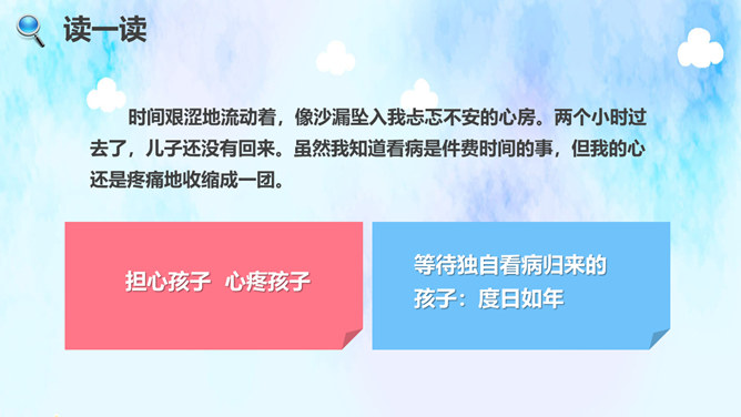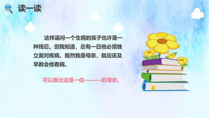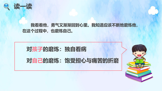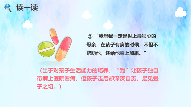 快速阅读课文,注意读准生字词,并说一说这篇课文主要讲了一件什么事情,表达了什么感情。中心:本文讲的是儿子感冒了,妈妈让他独自上医院,学会了看病的事。母亲用这种方式,磨炼儿子独自面对生活的能力,表达了母亲对儿子深深的爱。在整个事件的过程中,母亲的情感有什么样的变化?画出描写母亲语言和心理的句子,体会母亲的感情变化。细读课文,思考问题:课文中哪些地方让你感动?请画出来,并做批注。