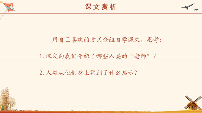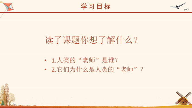 同学们,你们知道飞机是谁发明的吗?最初的轮船是怎么发明的吗?读了课题你想了解什么?1.人类的“老师”是谁?2.它们为什么是人类的“老师”?同学们,你们心目中的老师是什么样的?课题中的“老师”为什么要加上引号?这些“老师”究竟是谁呢?1. 大声读课文。要求:读准字音,读通句子,读顺课文。2.思考:课文向我们介绍了什么?