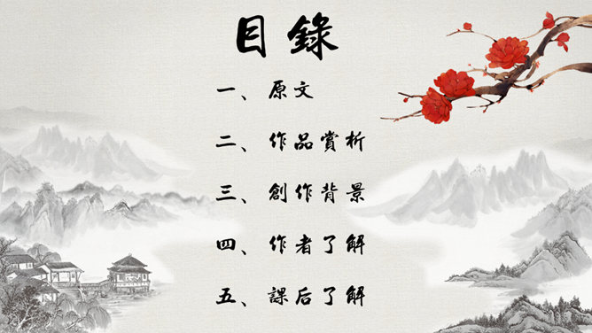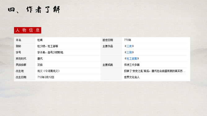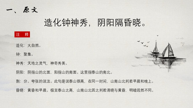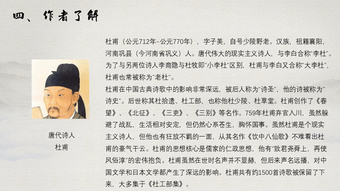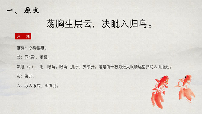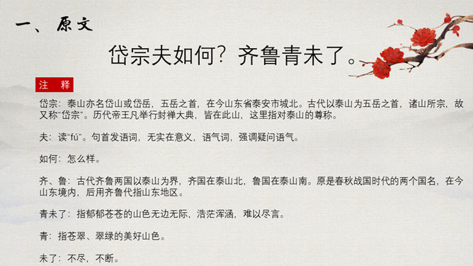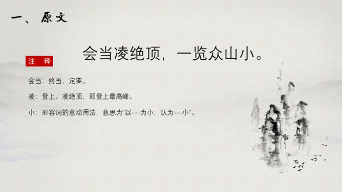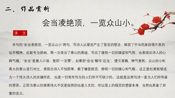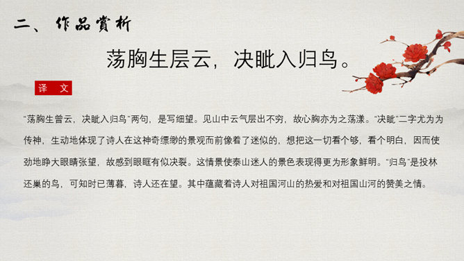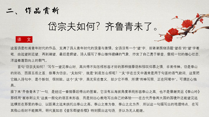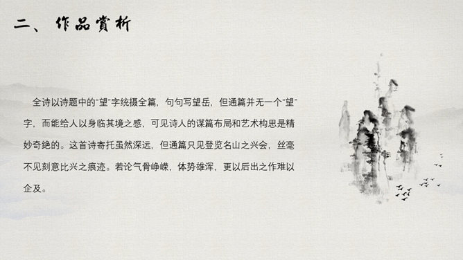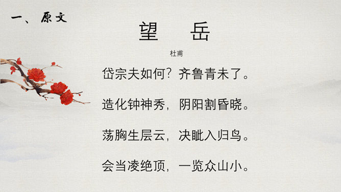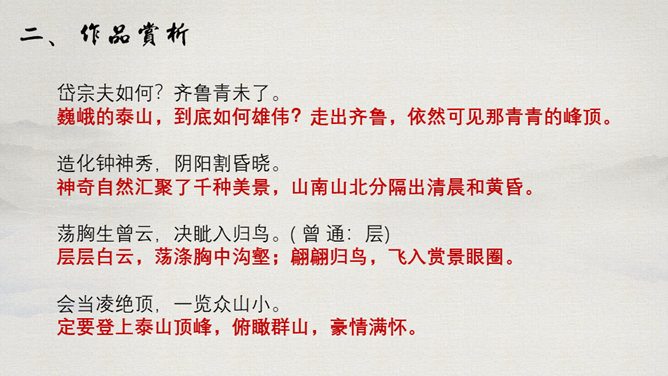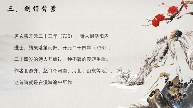 唐玄宗开元二十三年(735),诗人到洛阳应进士,结果落第而归,开元二十四年(736),二十四岁的诗人开始过一种不羁的漫游生活。作者北游齐、赵(今河南、河北、山东等地),这首诗就是在漫游途中所作。全诗以诗题中的“望”字统摄全篇,句句写望岳,但通篇并无一个“望”字,而能给人以身临其境之感,可见诗人的谋篇布局和艺术构思是精妙奇绝的。这首诗寄托虽然深远,但通篇只见登览名山之兴会,丝毫不见刻意比兴之痕迹。若论气骨峥嵘,体势雄浑,更以后出之作难以企及。所属专题:望岳ppt。