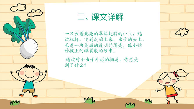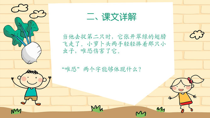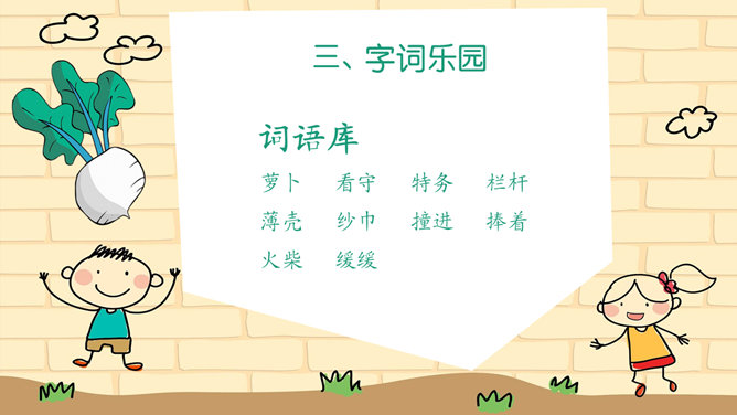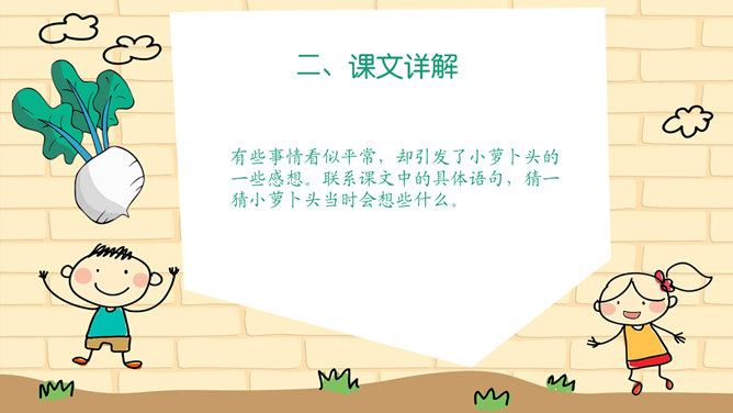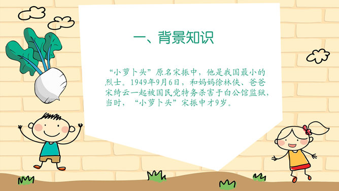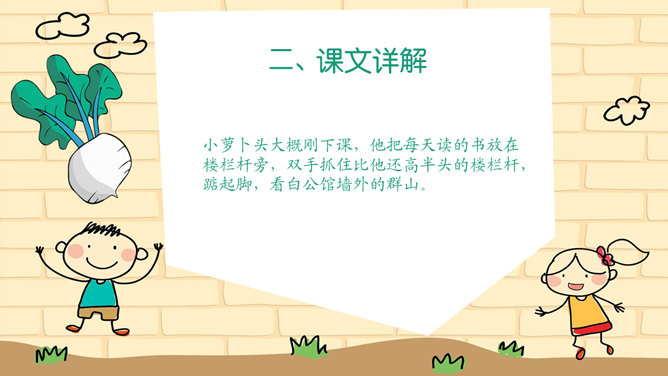本文讲述了小萝卜头在牢房里勤奋学习,不断进步的故事课文真实、生动的表现了小萝卜头在极其艰苦的条件下努力学习的情形。没有纸笔,没有宽敞明亮的教室,有的只是又闷又热的牢房,没有自由,有的只是敌人的监视可就是在这样的环境下,小萝卜头却表现出顽强的意志和坚定的信念再苦再难,也不放弃学习,不放弃希望!描写,就是把所写对象的状貌、情态描绘出来。描写能再现事物栩栩如生的具体形象,让读者如见其人、似睹其物,它是作文的基本功。一提到描写,很多同学都知道好的描写要达到生动、具体、形象。