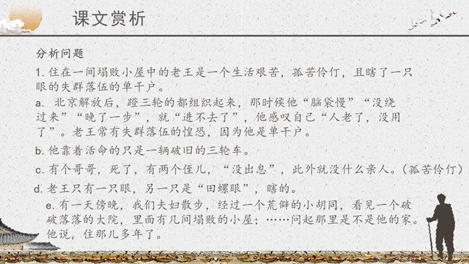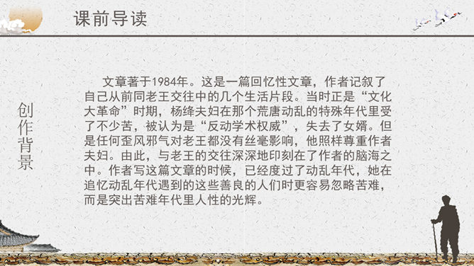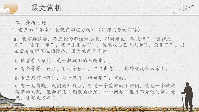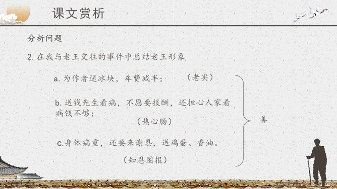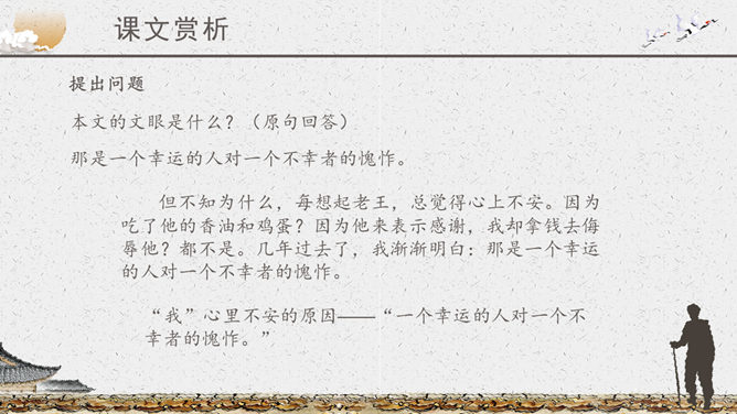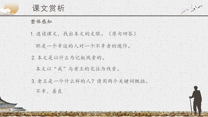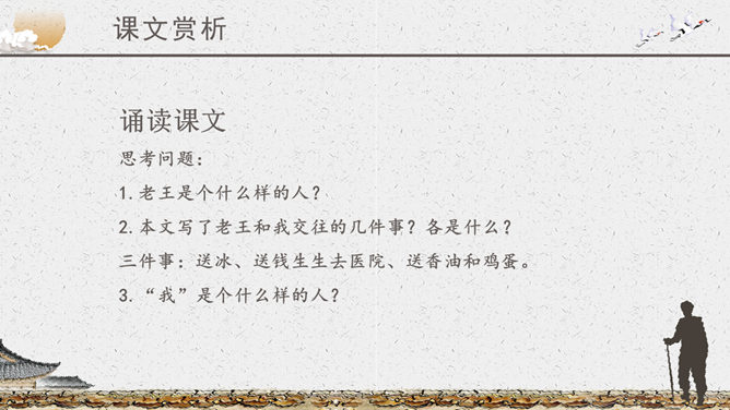 诵读课文思考问题:1.老王是个什么样的人?2.本文写了老王和我交往的几件事?各是什么?三件事:送冰、送钱生生去医院、送香油和鸡蛋。3.“我”是个什么样的人?1.速读课文,找出本文的文眼。(原句回答)那是一个幸运的人对一个不幸者的愧怍。2.本文是以什么为记叙线索的。本文以“我”与老王的交往为线索。3.老王是一个什么样的人?请用两个关键词概括。不幸、善良。所属专题:老王ppt。