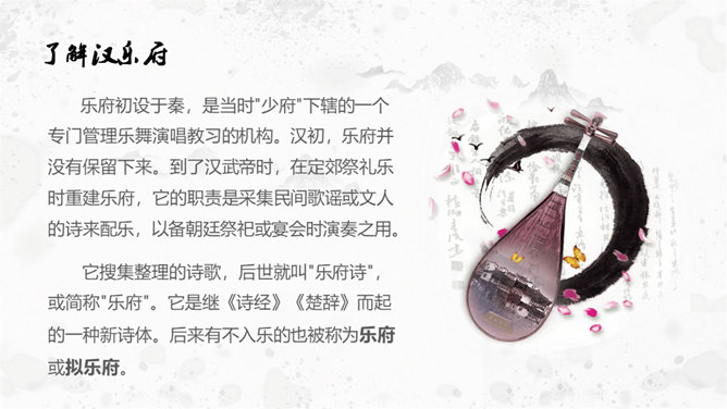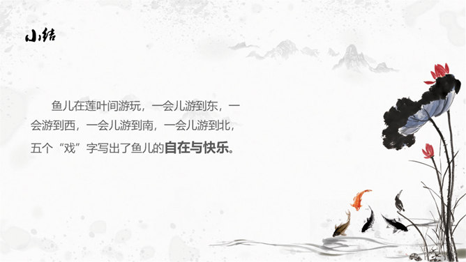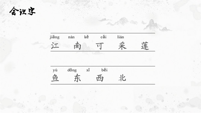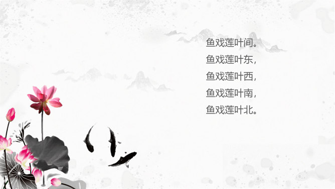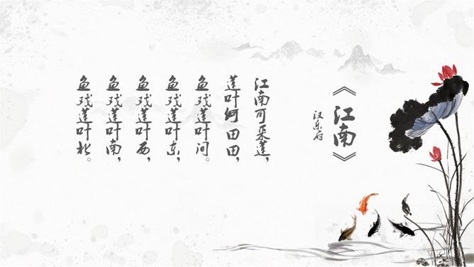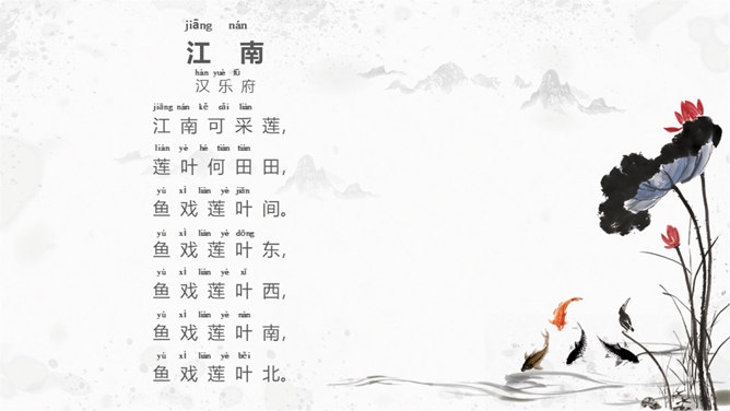 思考:1. 在荷塘里除了荷叶、莲花和莲蓬,还有什么?2. 鱼儿在莲叶间是怎样游动的?哪些地方写出了鱼儿的快乐和自在?鱼儿在莲叶间游玩,一会儿游到东,一会游到西,一会儿游到南,一会儿游到北,五个“戏”字写出了鱼儿的自在与快乐。乐府初设于秦,是当时"少府"下辖的一个专门管理乐舞演唱教习的机构。汉初,乐府并没有保留下来。到了汉武帝时,在定郊祭礼乐时重建乐府,它的职责是采集民间歌谣或文人的诗来配乐,以备朝廷祭祀或宴会时演奏之用。所属专题:江南ppt。
