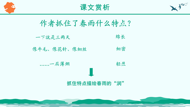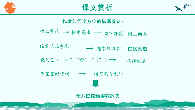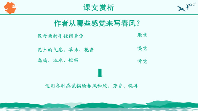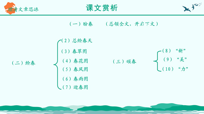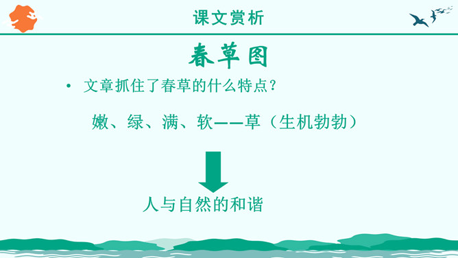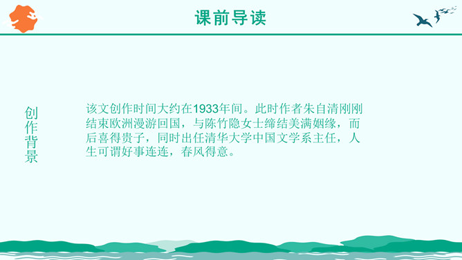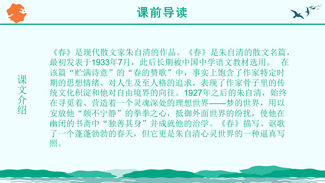 朗读指导:1、读音正确 ,声音洪亮。2、把握好感情基调的变化。3、读出抑扬顿挫、轻重缓急的美感。“ 一年之计在于春”,激励人们把握时机,奋发向上,辛勤劳作,也抒发了作者热爱生活,进而要创造美好生活,积极向上的感情。这篇优美的写景抒情散文抓住春景的特点,描绘了大地春回、生机勃发的动人景象,赞美春的活力带给人以希望和力量,激励人们抓紧春光努力工作,奋发向上。所属专题:春ppt。