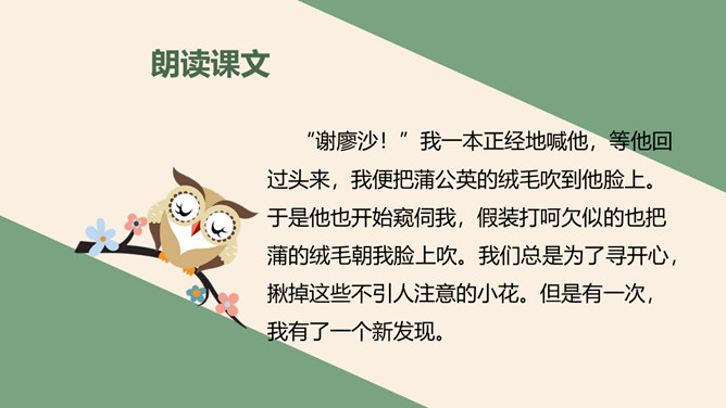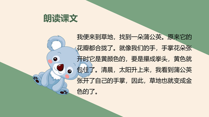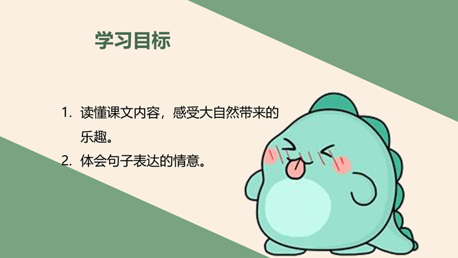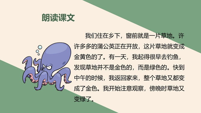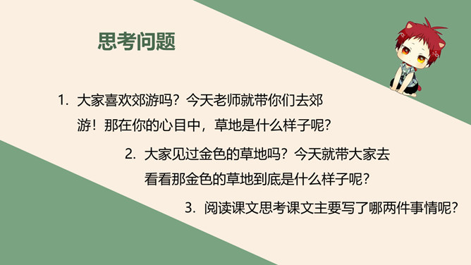 学习目标:正确流利地朗读课文会认2个生字,会写23个生字。思考问题:大家喜欢郊游吗?今天老师就带你们去郊游!那在你的心目中,草地是什么样子呢?大家见过金色的草地吗?今天就带大家去看看那金色的草地到底是什么样子呢?阅读课文思考课文主要写了哪两件事情呢?学习目标:读懂课文内容,感受大自然带来的乐趣。体会句子表达的情意。所属专题:金色的草地ppt。