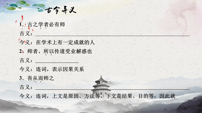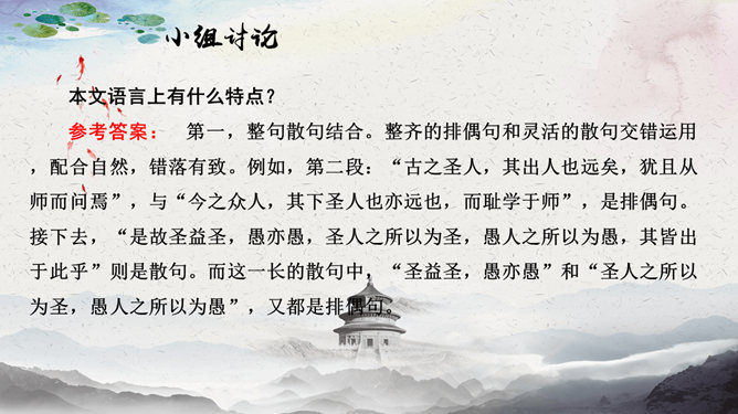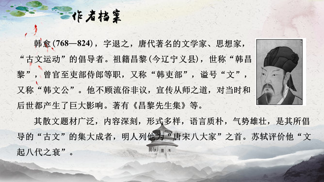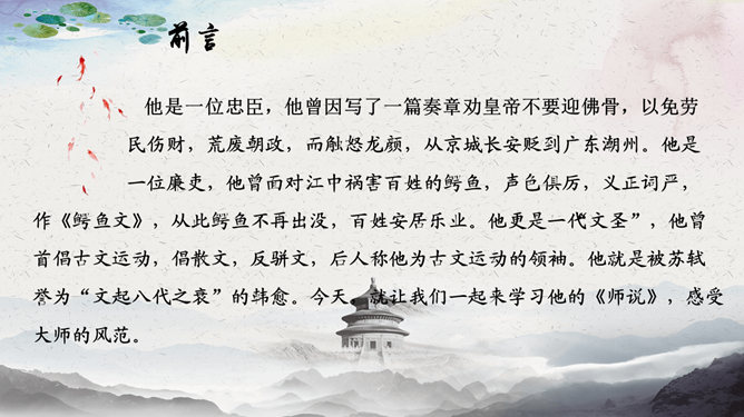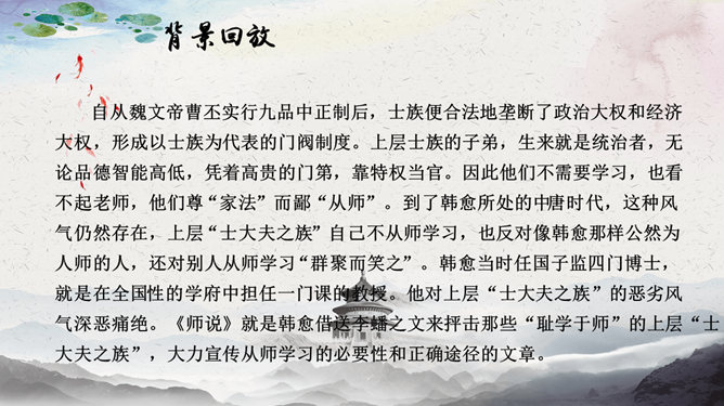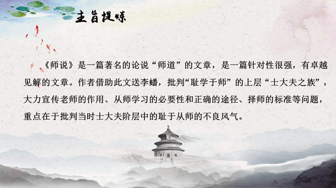 《师说》是一篇著名的论说师道的文章,是一篇针对性很强,有卓越见解的文章。作者借助此文送李蟠,批判耻学于师的上层士大夫之族,大力宣传老师的作用、从师学习的必要性和正确的途径、择师的标准等问题,重点在于批判当时士大夫阶层中的耻于从师的不良风气。