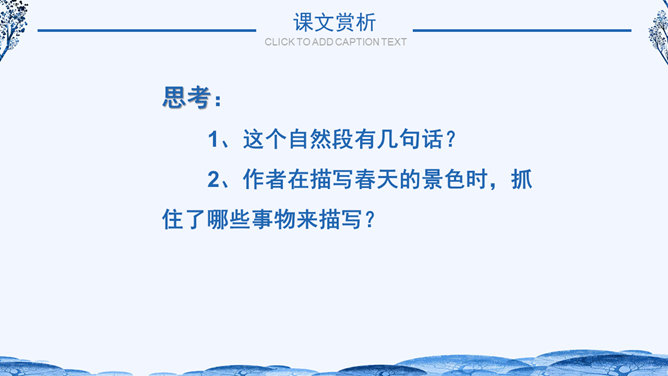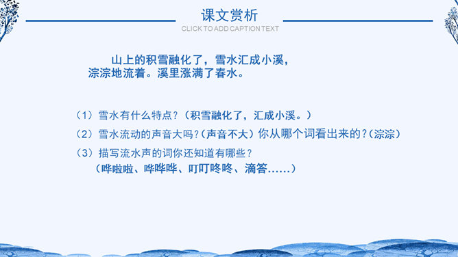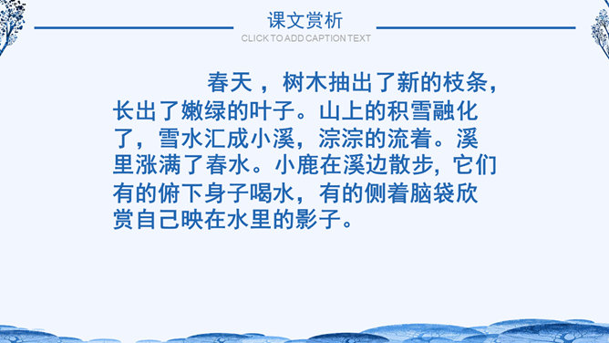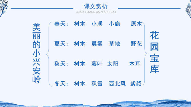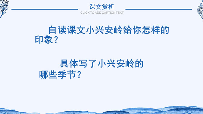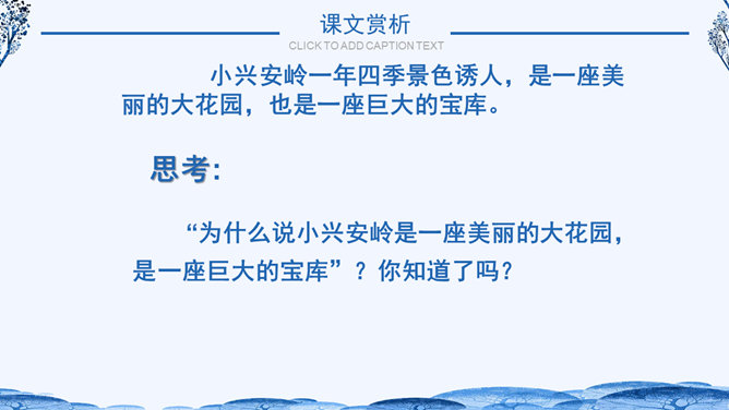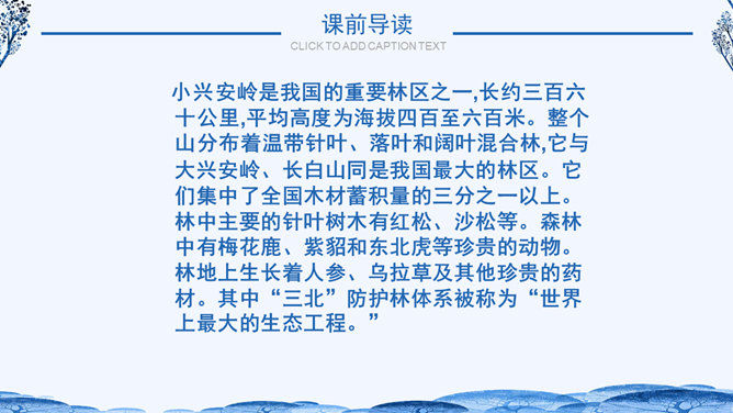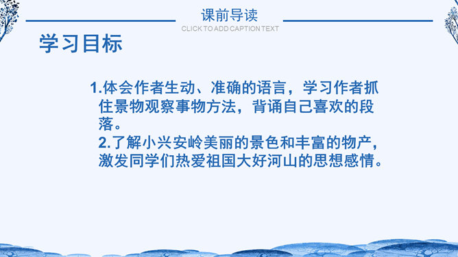 学习目标:1.体会作者生动、准确的语言,学习作者抓住景物观察事物方法,背诵自己喜欢的段落。2.了解小兴安岭美丽的景色和丰富的物产,激发同学们热爱祖国大好河山的思想感情。自读课文小兴安岭给你怎样的印象?具体写了小兴安岭的哪些季节?思考:1、这个自然段有几句话?2、作者在描写春天的景色时,抓住了哪些事物来描写?所属专题:美丽的小兴安岭ppt。
