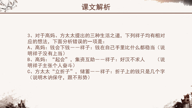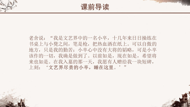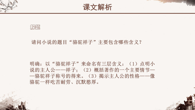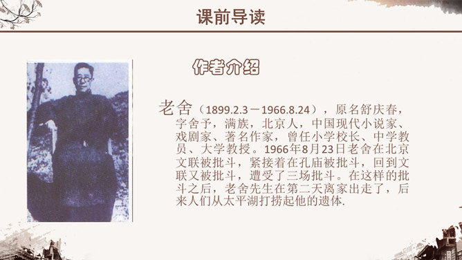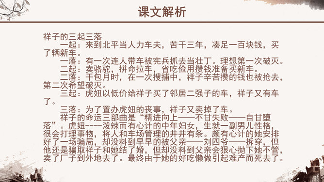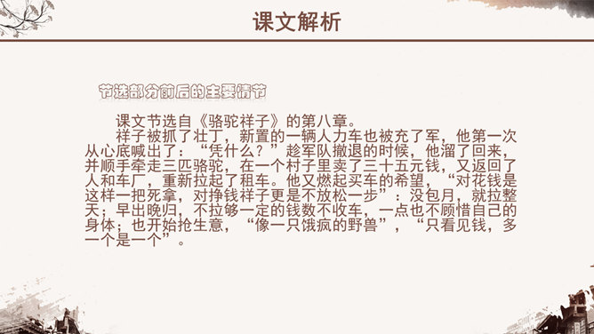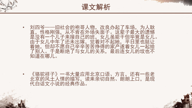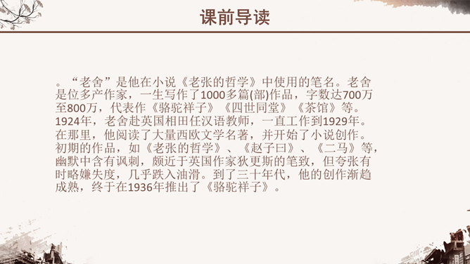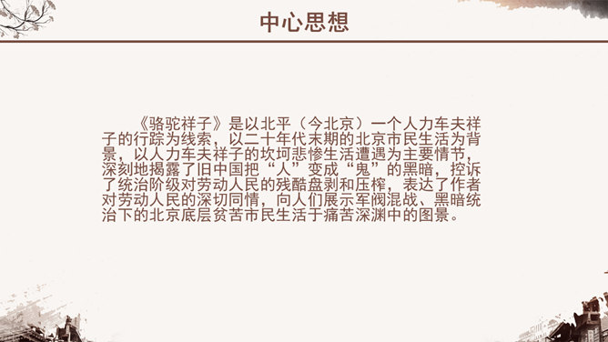 《骆驼祥子》是以北平(今北京)一个人力车夫祥子的行踪为线索,以二十年代末期的北京市民生活为背景,以人力车夫祥子的坎坷悲惨生活遭遇为主要情节,深刻地揭露了旧中国把“人”变成“鬼”的黑暗,控诉了统治阶级对劳动人民的残酷盘剥和压榨,表达了作者对劳动人民的深切同情,向人们展示军阀混战、黑暗统治下的北京底层贫苦市民生活于痛苦深渊中的图景。《骆驼祥子》一书大量应用北京口语、方言,还有一些老北京的风土人情的描写,读来亲切自然、朗朗上口,是现代白话文小说的经典作品。所属专题:骆驼祥子ppt。
