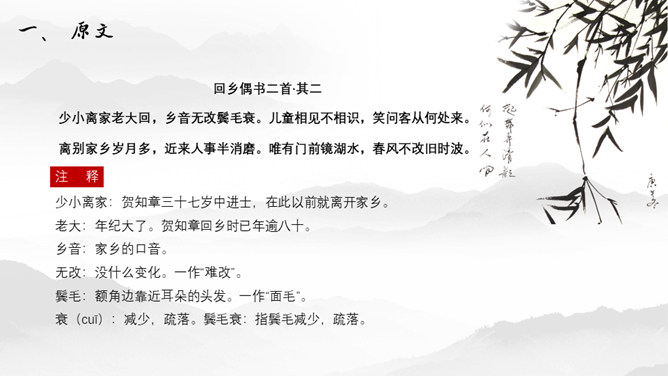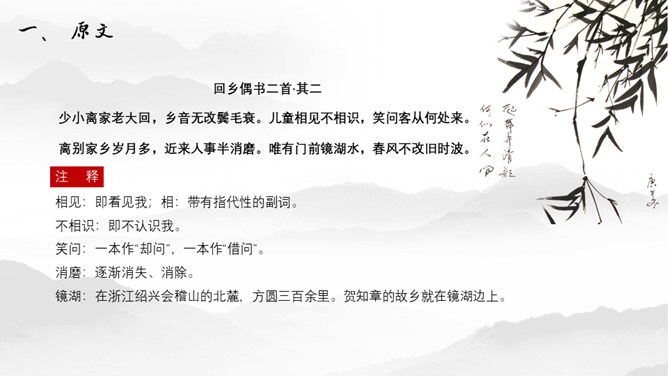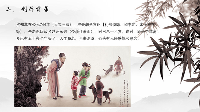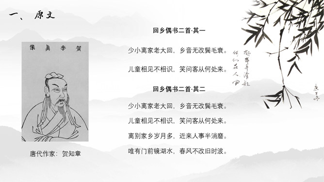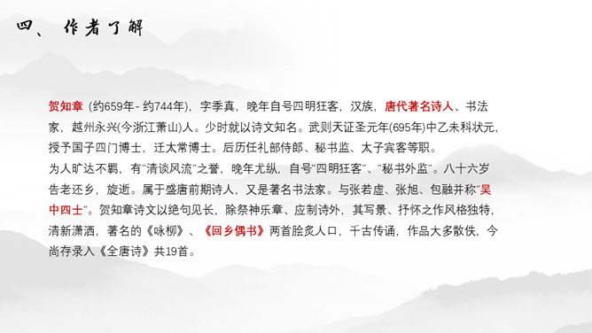 贺知章早年迁居山阴(今浙江绍兴市)。少时即以诗文知名。唐武后证圣元年(695)中进士、状元,是浙江历史上第一位有资料记载的状元。贺知章中状元后,初授国子四门博士,后迁太常博士。开元十年(722),由丽正殿修书使张说推荐入该殿书院,参与撰修《六典》、《文纂》等书,未成,转官太常少卿。十三年为礼部侍郎、集贤院学士。后调任太子右庶子、侍读、工部侍郎。二十六年改官太子宾客、银青光禄大夫兼正授秘书监,因而人称"贺监"。