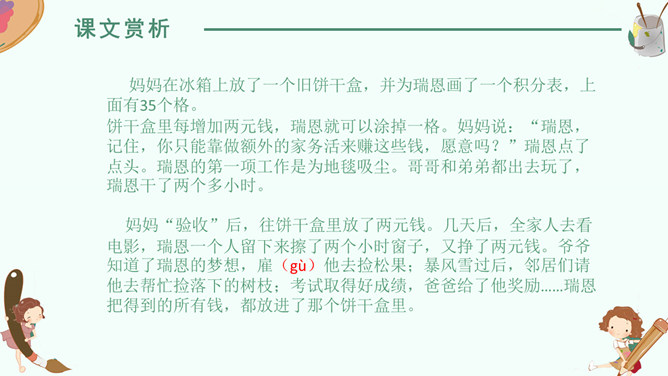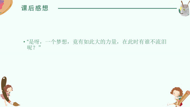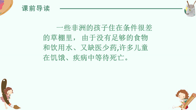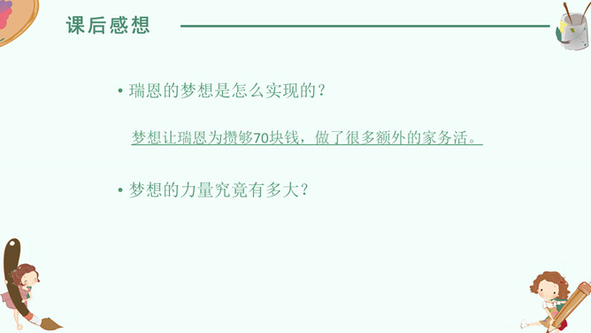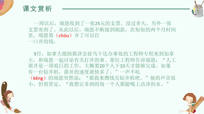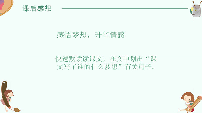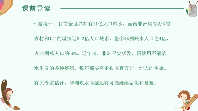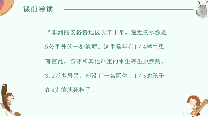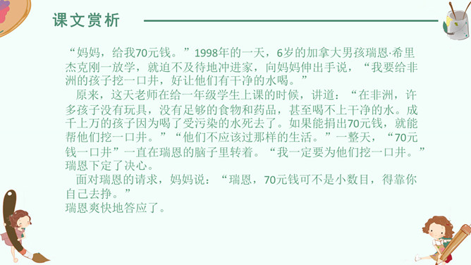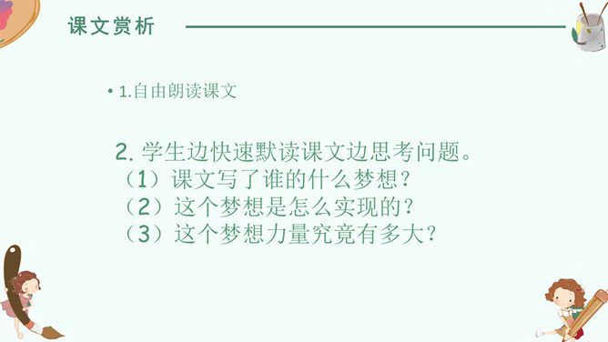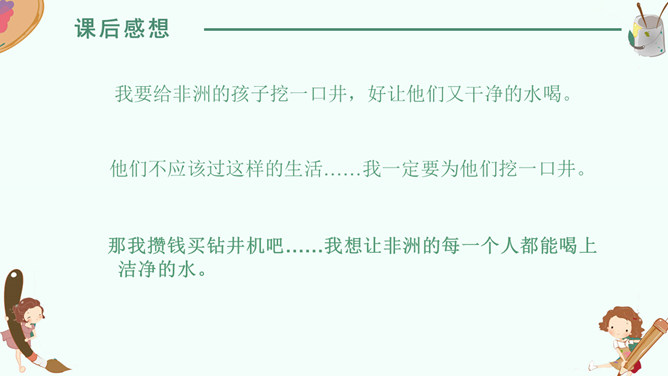感悟梦想,升华情感,快速默读读课文,在文中划出“课文写了谁的什么梦想”有关句子。我要给非洲的孩子挖一口井,好让他们又干净的水喝。 那我攒钱买钻井机吧……我想让非洲的每一个人都能喝上洁净的水。2. 学生边快速默读课文边思考问题。(1)课文写了谁的什么梦想?(2)这个梦想是怎么实现的?(3)这个梦想力量究竟有多大?