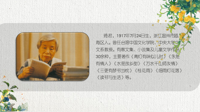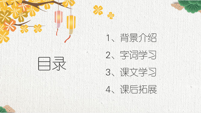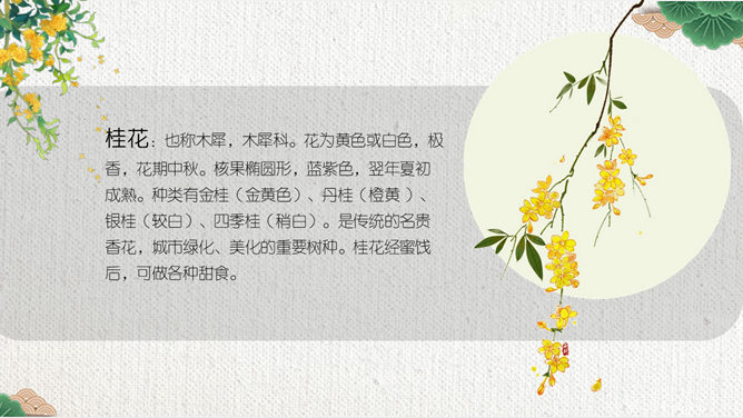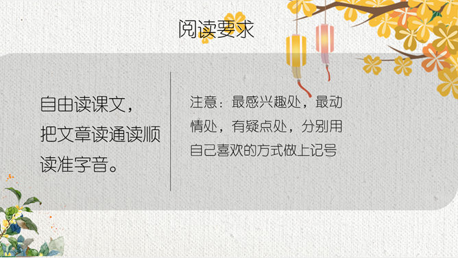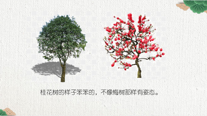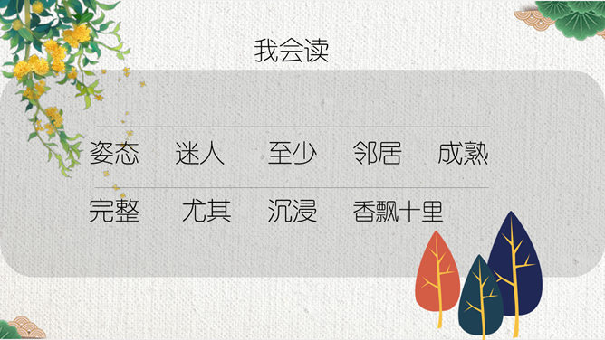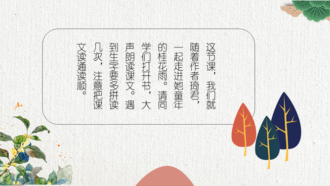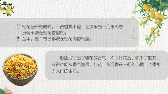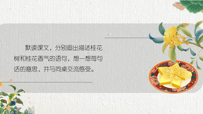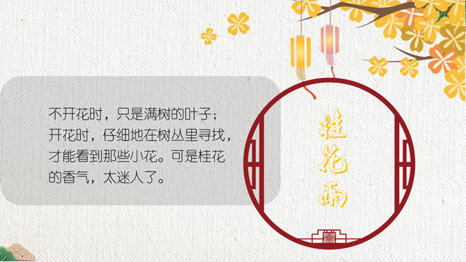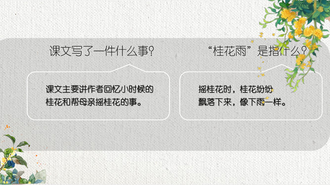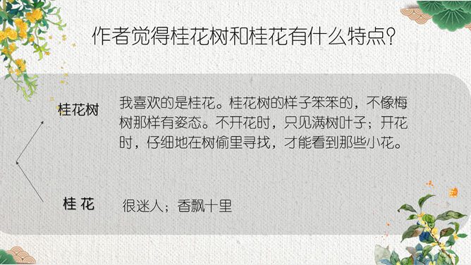 这节课,我们就随着作者琦君,一起走进她童年的桂花雨。请同学们打开书,大声朗读课文。遇到生字要多拼读几次,注意把课文读通读顺。默读课文,分别画出描述桂花树和桂花香气的语句,想一想每句话的意思,并与同桌交流感受。作者觉得桂花树和桂花有什么特点?我喜欢的是桂花。桂花树的样子笨笨的,不像梅树那样有姿态。不开花时,只见满树叶子;开花时,仔细地在树偷里寻找,才能看到那些小花。 桂花树的样子笨笨的,不像梅树那样有姿态。细细香风淡淡烟,竞收桂子庆丰年。儿童解得摇花乐,花雨缤纷入梦甜。所属专题:桂花雨ppt。