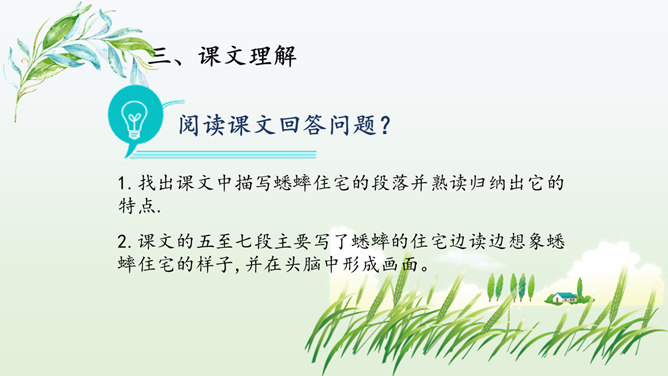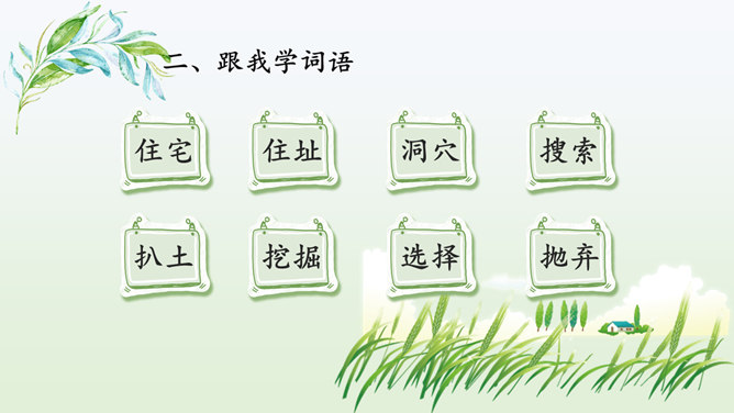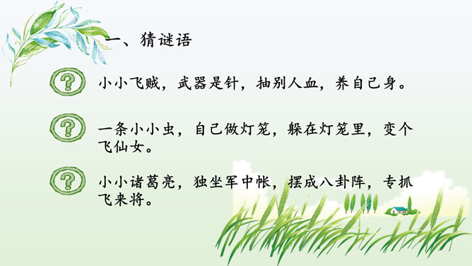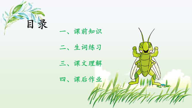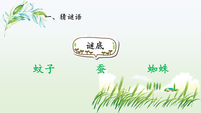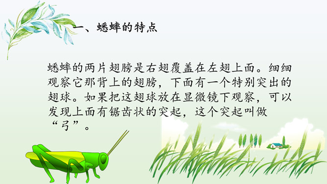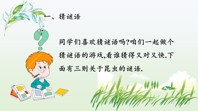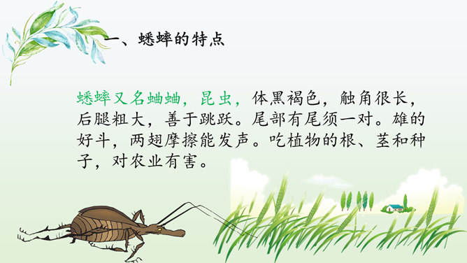 同学们喜欢猜谜语吗?咱们一起做个猜谜语的游戏,看谁猜得又对又快.下面有三则关于昆虫的谜语。1.找出课文中描写蟋蟀住宅的段落并熟读归纳出它的特点。2.课文的五至七段主要写了蟋蟀的住宅边读边想象蟋蟀住宅的样子,并在头脑中形成画面。我们能不能用一句话把蟋蟀住宅的特点。加以概括,把这些特点介绍出来呢?1.结合图形给大家介绍一下蟋蟀是如何使用这些工具的。小活动:把自己想象成一只可爱的小蟋蟀,结合图形简单介绍建造住宅的情况。所属专题:蟋蟀的住宅ppt。