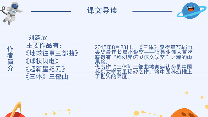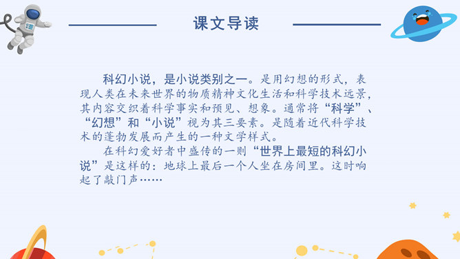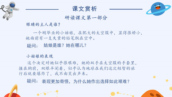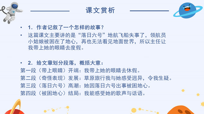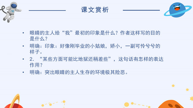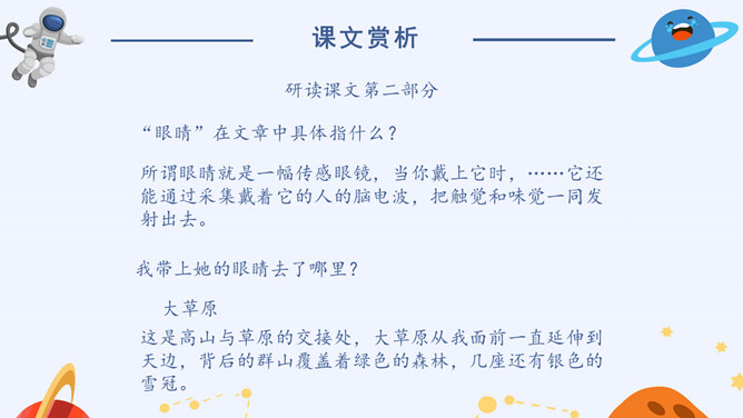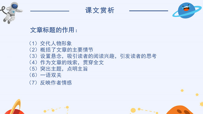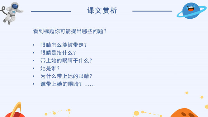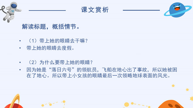 看到标题你可能提出哪些问题?眼睛怎么能被带走?眼睛是指什么?带上她的眼睛干什么?她是谁?为什么带上她的眼睛?谁带上她的眼睛?文章标题的作用:(1)交代人物形象(2)概括了文章的主要情节(3)设置悬念,吸引读者的阅读兴趣,引发读者的思考(4)作为文章的线索,贯穿全文(5)突出主题,点明主旨(6)一语双关(7)反映作者情感。解读标题,概括情节。(1)带上她的眼睛去干嘛?带上她的眼睛去度假。(2)为什么要带上她的眼睛?因为她是“落日六号”的领航员,飞船在地心出了事故,所以她被困在了地心。所以带上小女孩的眼睛最后一次领略地球表面的风光。所属专题:带上她的眼睛ppt。