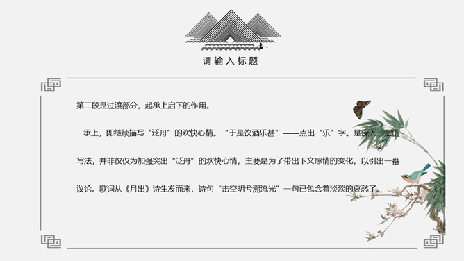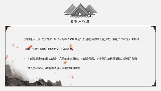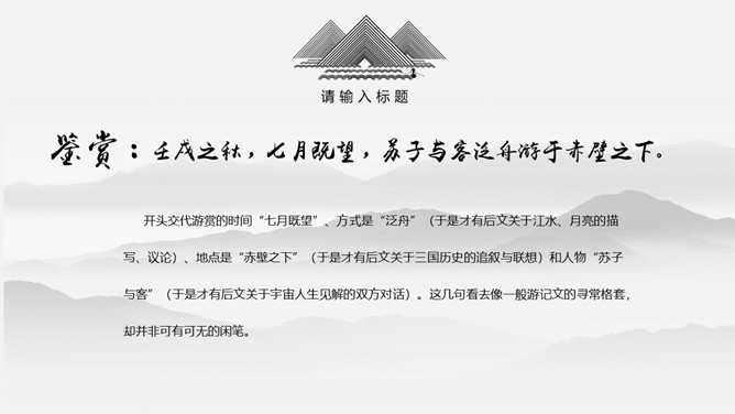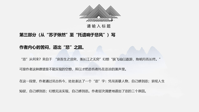 本文押韵比较自由,只有个别散句不押韵。请同学们在文中标出押韵字并体会换韵情况。开头交代游赏的时间“七月既望”、方式是“泛舟”(于是才有后文关于江水、月亮的描写、议论)、地点是“赤壁之下”(于是才有后文关于三国历史的追叙与联想)和人物“苏子与客”(于是才有后文关于宇宙人生见解的双方对话)。这几句看去像一般游记文的寻常格套,却并非可有可无的闲笔。为苏轼伴奏的客触景生怀,有感于人生的短促。他按自己的感受吹箫,箫声是一种悲凉的调子,由此引出苏轼的惊讶与询问,于是由客的回答带出第三段文字,启下写“悲”。“托遗响于悲风。”