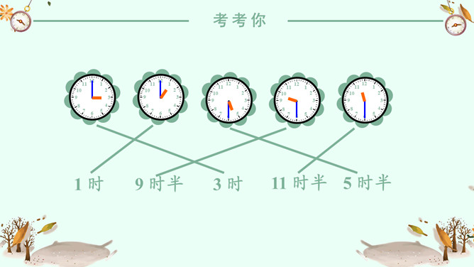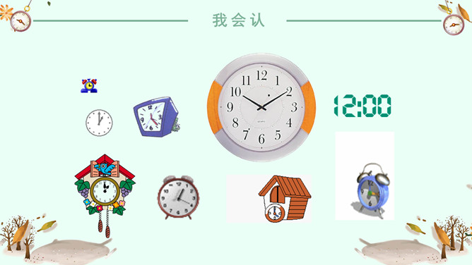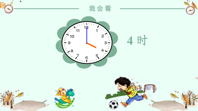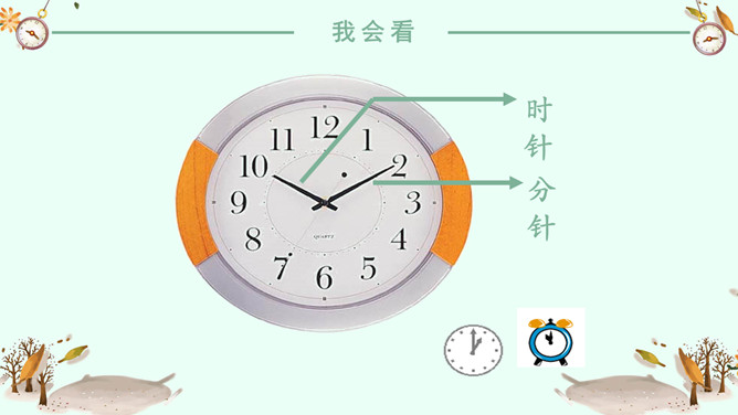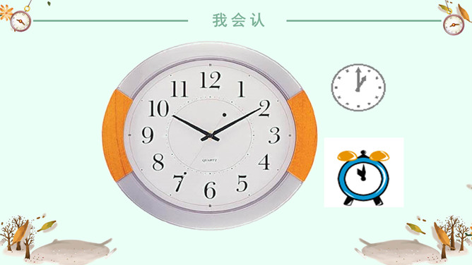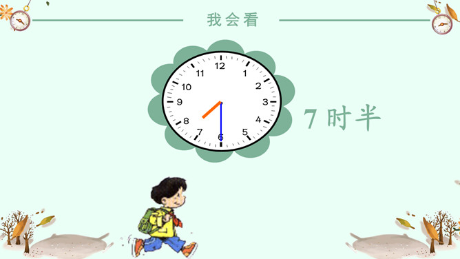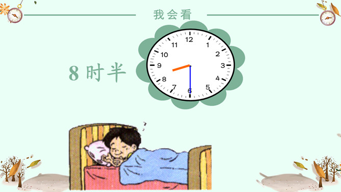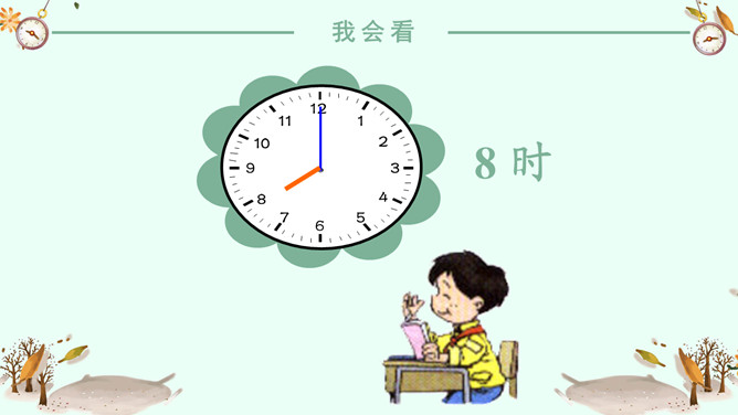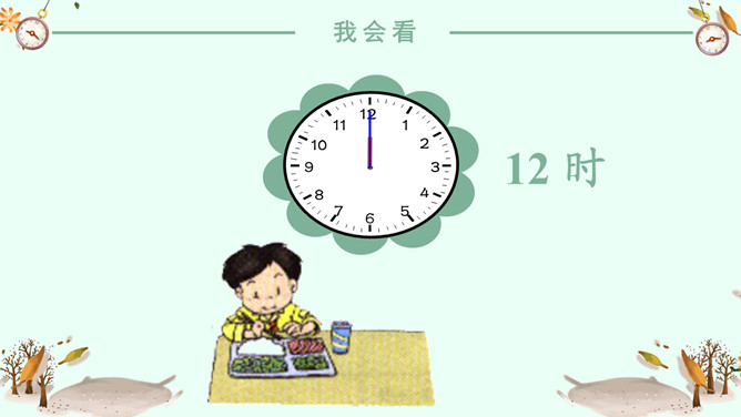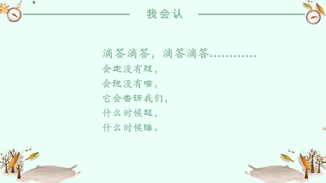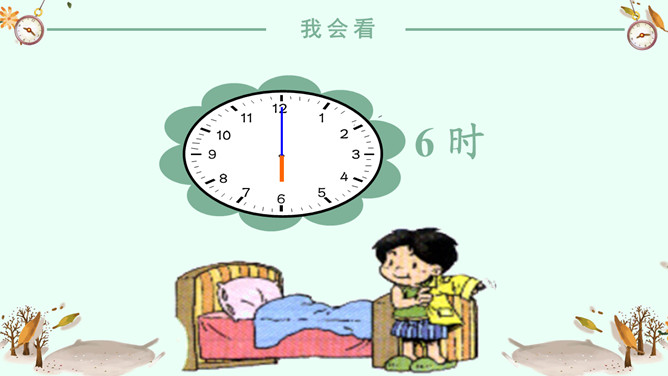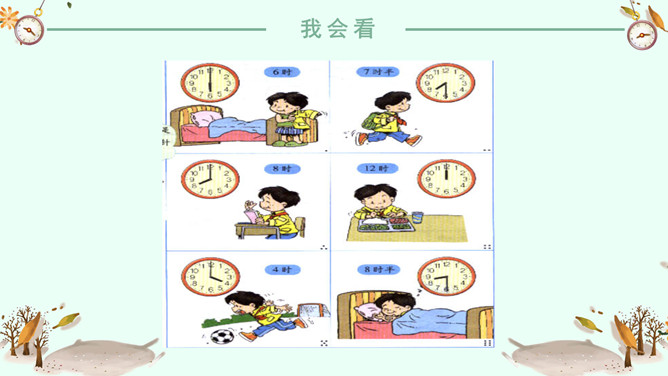 我会认:滴答滴答,滴答滴答…………会走没有腿,会说没有嘴,它会告诉我们,什么时候起,什么时候睡。分针指着12,时针指着几,就是几时。分针指着6,时针走过几,就是几时半。 分针指着12,时针指着几,就是几时。(1)太阳刚升起,大约是几时?(2)太阳刚落下,大约是几时?