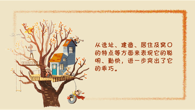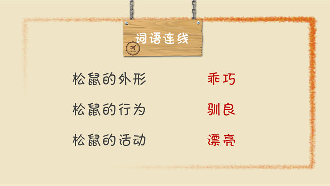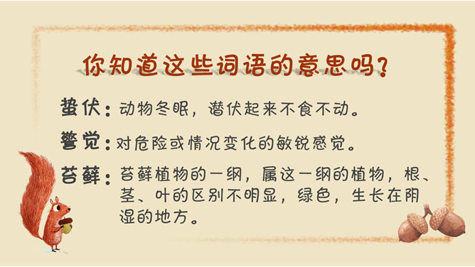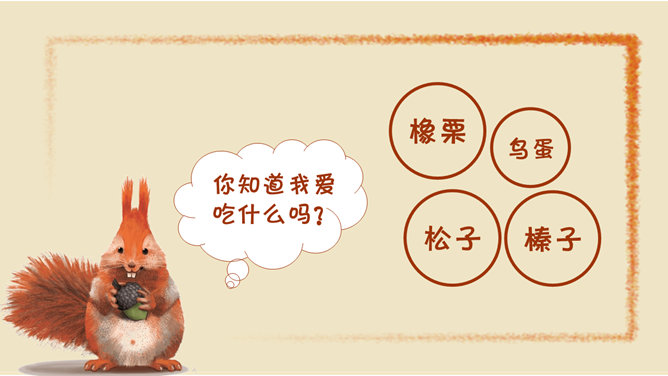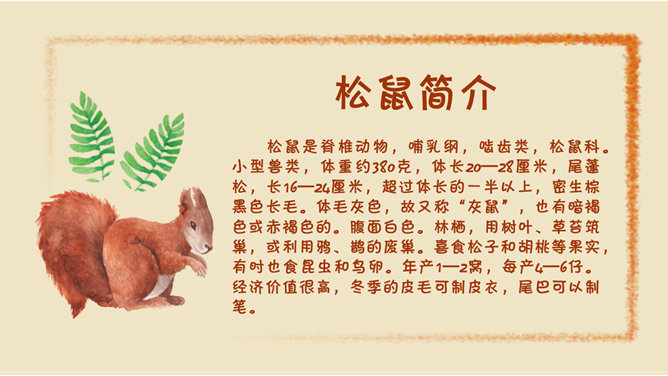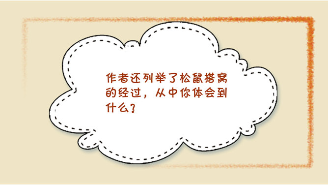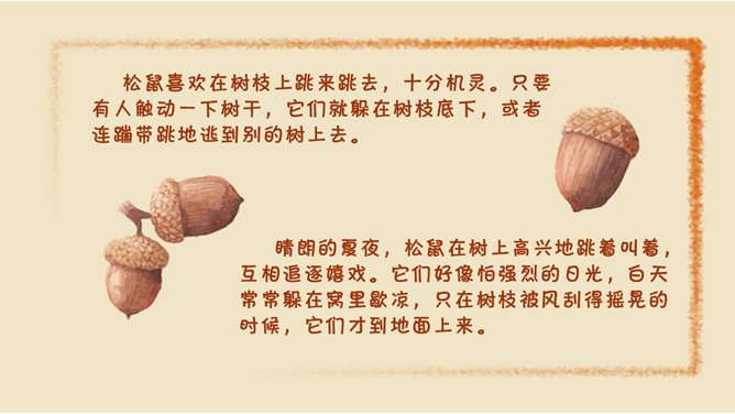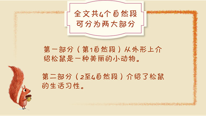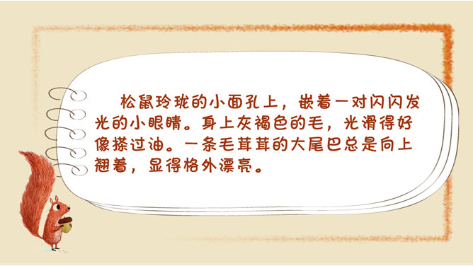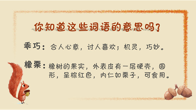 你知道这些词语的意思吗?乖巧:合人心意,讨人喜欢;机灵,巧妙。橡栗:橡树的果实,外表皮有一层硬壳,圆形,呈棕红色,内仁如栗子,可食用。全文共4个自然段,可分为两大部分。第一部分(第1自然段)从外形上介绍松鼠是一种美丽的小动物。第二部分(2至4自然段)介绍了松鼠的生活习性。从选址、建造、居住及窝口的特点等方面来表现它的聪明、勤快,进一步突出了它的乖巧。结合课文请同学说出三点松鼠的特点。课后观察一种动物的外形和生活习性写一写。所属专题:松鼠ppt。