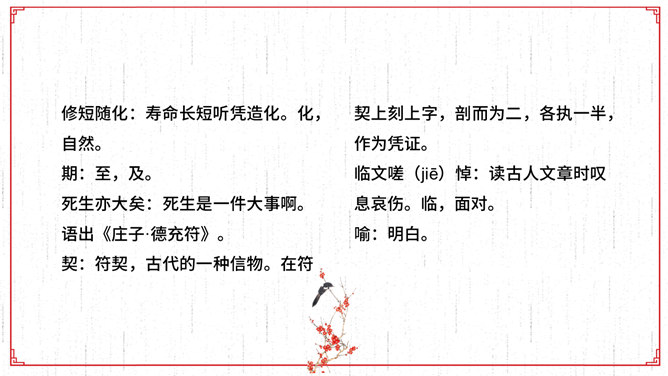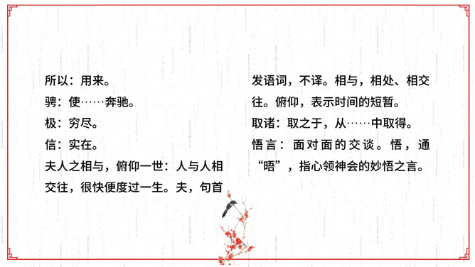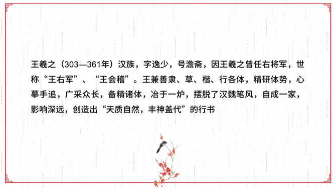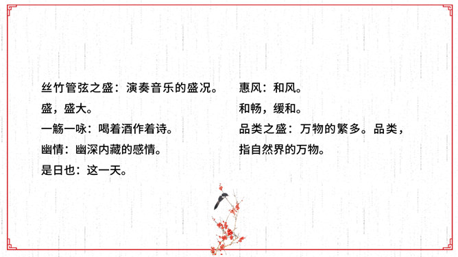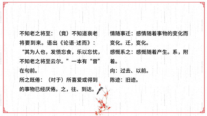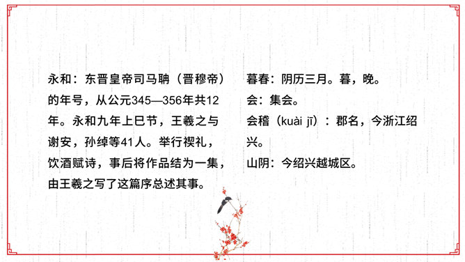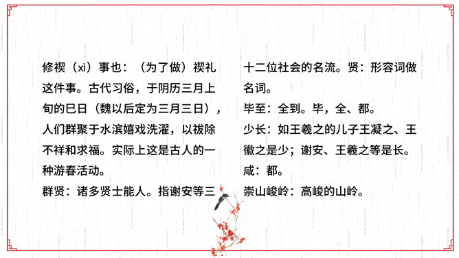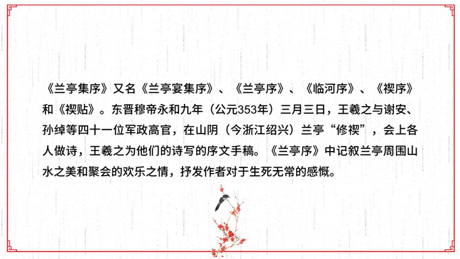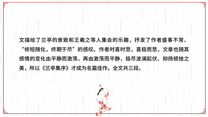 文描绘了兰亭的景致和王羲之等人集会的乐趣,抒发了作者盛事不常、“修短随化,终期于尽”的感叹。作者时喜时悲,喜极而悲,文章也随其感情的变化由平静而激荡,再由激荡而平静,极尽波澜起伏、抑扬顿挫之美,所以《兰亭集序》才成为名篇佳作。全文共三段。文章首段记叙兰亭聚会盛况,并写出与会者的深切感受。先点明聚会的时间、地点、缘由,后介绍与会的人数之多,范围之广,“群贤毕至,少长咸集”。接着写兰亭周围优美的环境。先写高远处:“崇山峻岭,茂林修竹”;再写近低处“清流激湍”;然后总写一笔:“映带左右”。用语简洁。富有诗情画意。