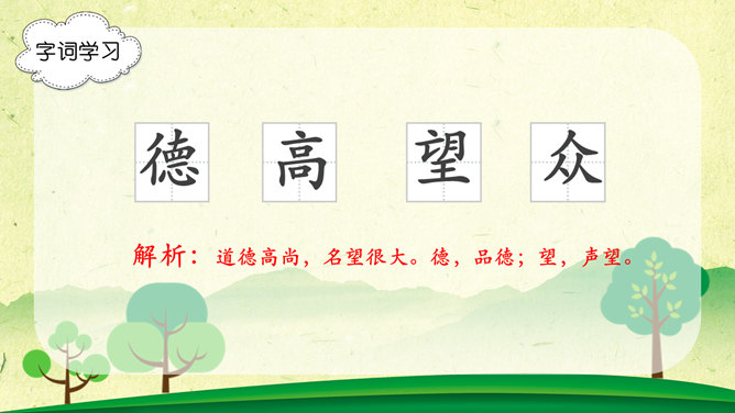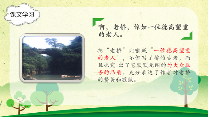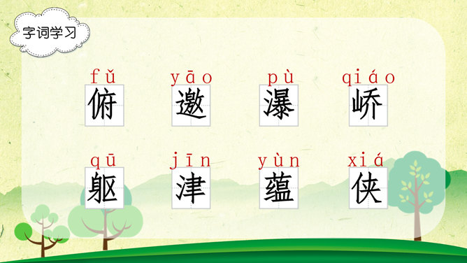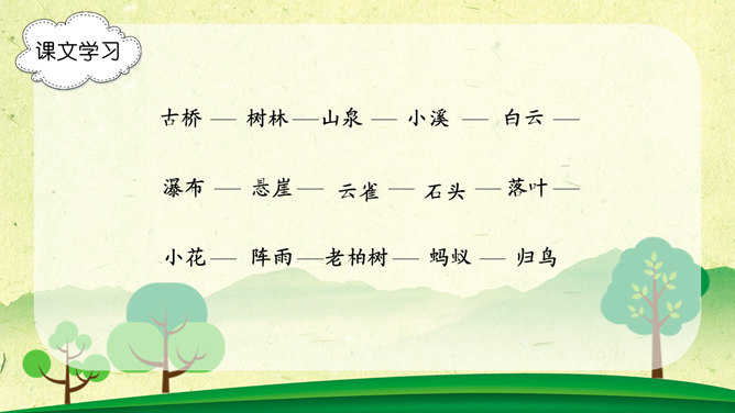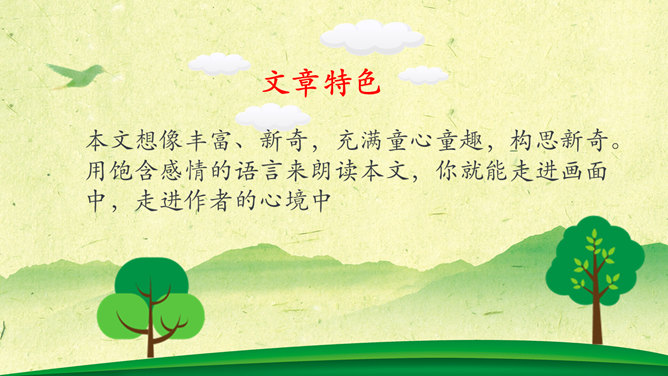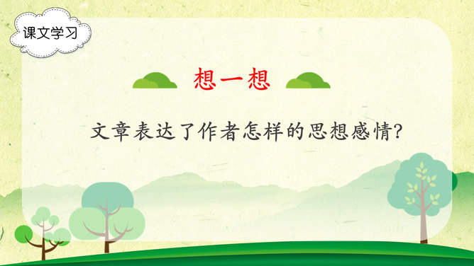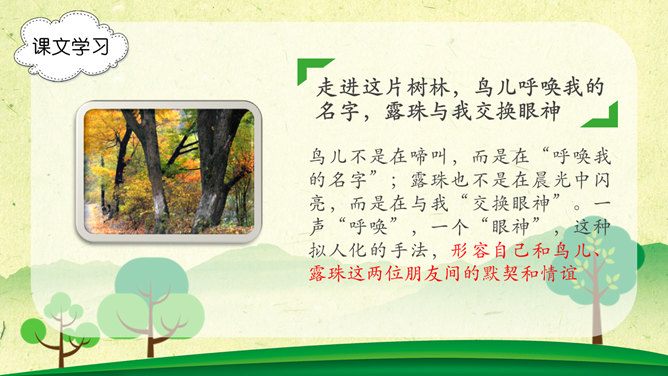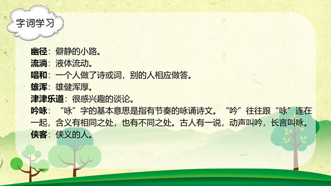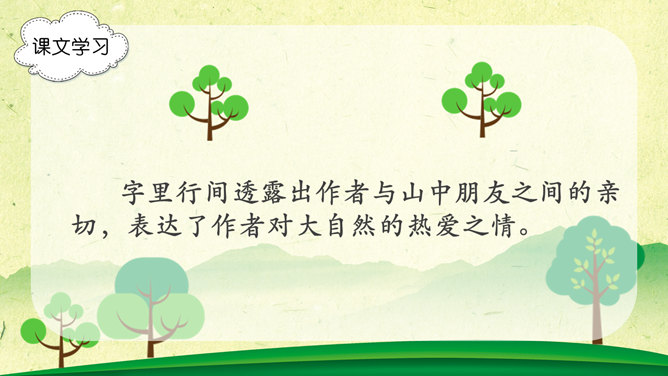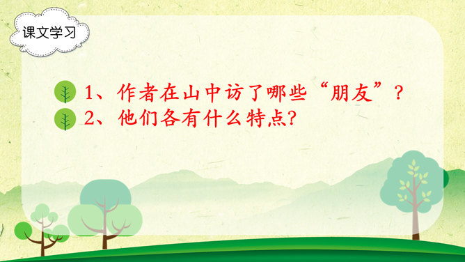 字词学习,幽径:僻静的小路。流淌:液体流动。唱和:一个人做了诗或词,别的人相应做答。雄浑:雄健浑厚。津津乐道:很感兴趣的谈论。吟咏:“咏”字的基本意思是指有节奏的咏诵诗文。“吟”往往跟“咏”连在一起,含义有相同之处,也有不同之处。古人有一说,动声叫吟,长言叫咏。侠客:侠义的人。想一想文章表达了作者怎样的思想感情?字里行间透露出作者与山中朋友之间的亲切,表达了作者对大自然的热爱之情。1、作者在山中访了哪些“朋友”?2、他们各有什么特点?本文想像丰富、新奇,充满童心童趣,构思新奇。用饱含感情的语言来朗读本文,你就能走进画面中,走进作者的心境中。