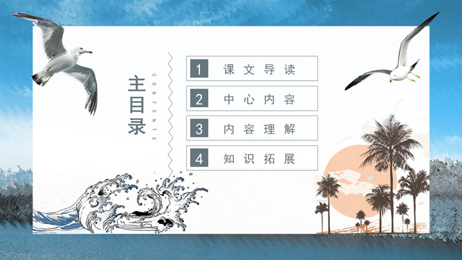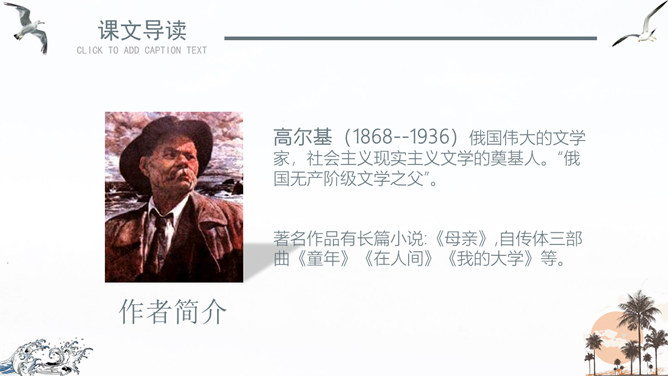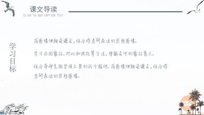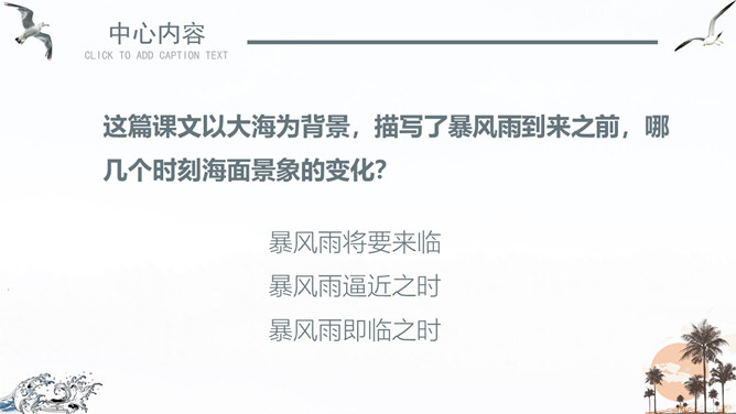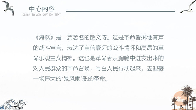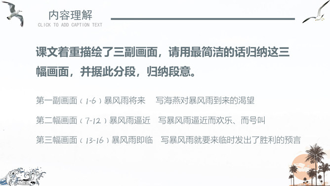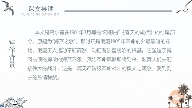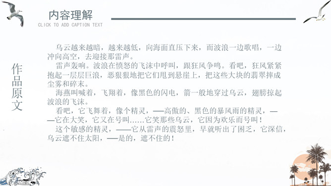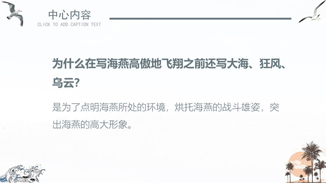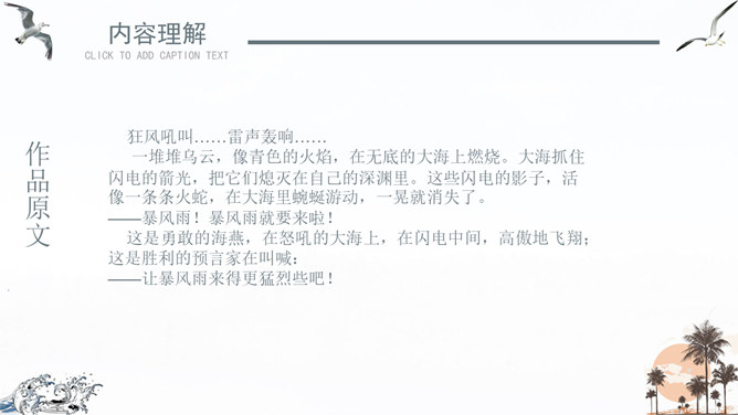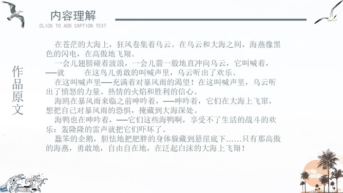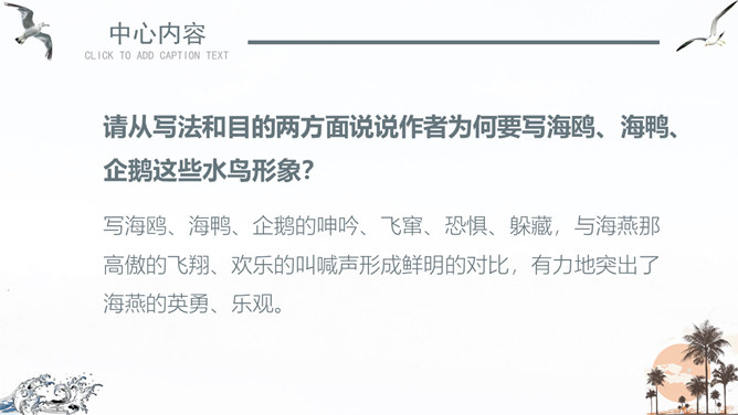 这是革命者掷地有声的战斗宣言,表达了自信豪迈的战斗情怀和高昂的革命乐观主义精神。这也是革命者从胸臆中迸发出来的对人民群众的革命召唤,号召人民行动起来,去迎接一场伟大的“暴风雨”般的革命。请从写法和目的两方面说说作者为何要写海鸥、海鸭、企鹅这些水鸟形象?写海鸥、海鸭、企鹅的呻吟、飞窜、恐惧、躲藏,与海燕那高傲的飞翔、欢乐的叫喊声形成鲜明的对比,有力地突出了海燕的英勇、乐观。为什么在写海燕高傲地飞翔之前还写大海、狂风、乌云?是为了点明海燕所处的环境,烘托海燕的战斗雄姿,突出海燕的高大形象。这篇课文以大海为背景,描写了暴风雨到来之前,哪几个时刻海面景象的变化? 暴风雨将要来临,暴风雨逼近之时,暴风雨即临之时。所属专题:海燕ppt。