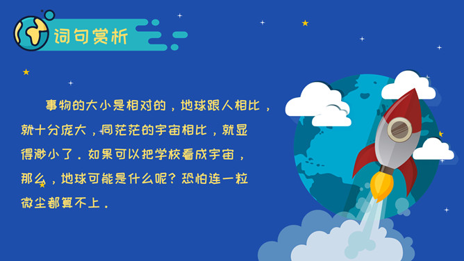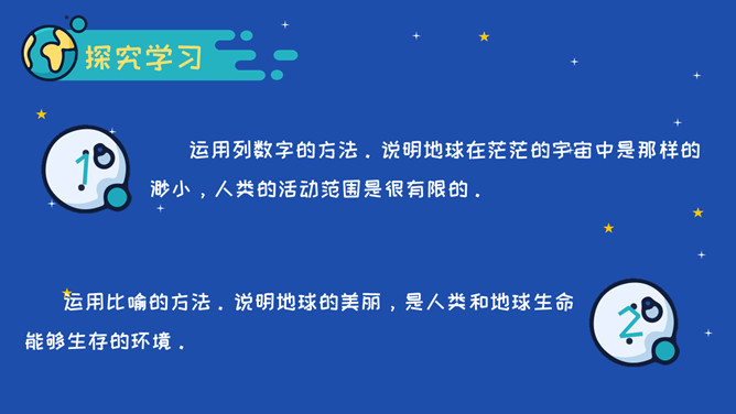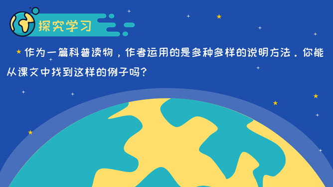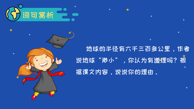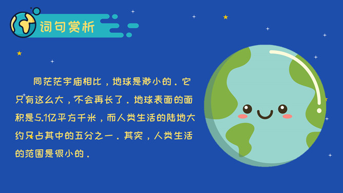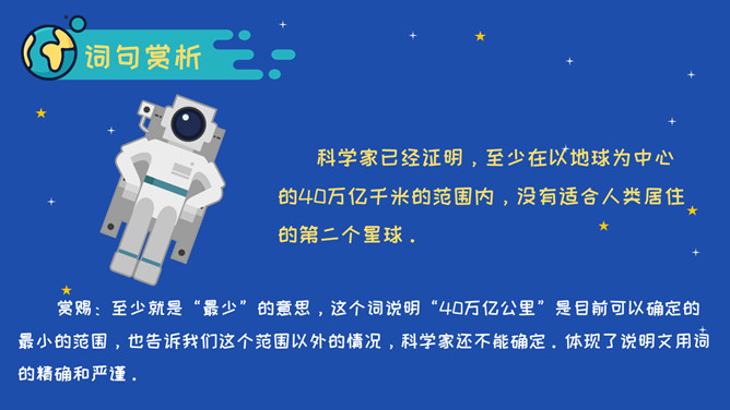至少就是“最少”的意思,这个词说明“40万亿公里”是目前可以确定的最小的范围,也告诉我们这个范围以外的情况,科学家还不能确定。体现了说明文用词的精确和严谨。地球的半径有六千三百多公里,作者说地球“渺小”,你认为有道理吗?根据课文内容,说说你的理由。事物的大小是相对的,地球跟人相比,就十分庞大,同茫茫的宇宙相比,就显得渺小了。如果可以把学校看成宇宙,那么,地球可能是什么呢?恐怕连一粒微尘都算不上。作为一篇科普读物,作者运用的是多种多样的说明方法。你能从课文中找到这样的例子吗?运用列数字的方法。说明地球在茫茫的宇宙中是那样的渺小,人类的活动范围是很有限的。所属专题:只有一个地球ppt。