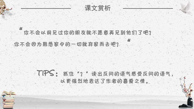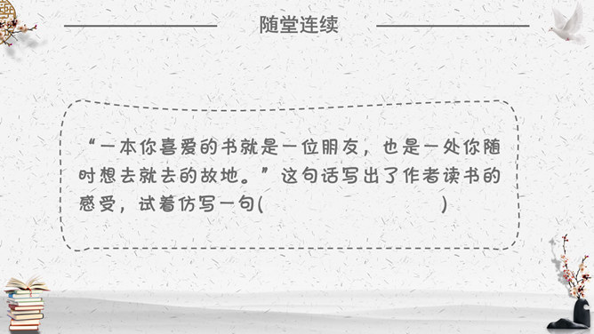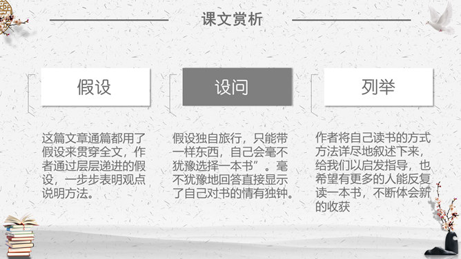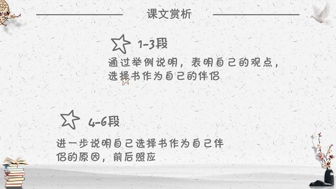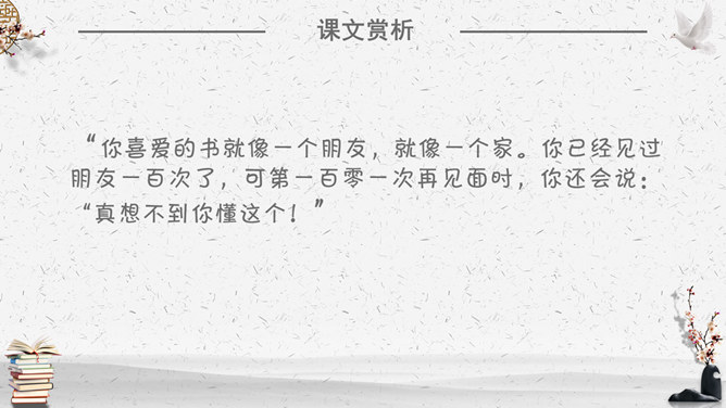 你不会以前见过你的朋友就不愿意再见到他们了吧?你不会因为熟悉家中的一切就弃家而去吧?“TIPS:抓住“?”读出反问的语气感受反问的语气,以更强烈地表达了作者的喜爱之情。通过举例说明,表明自己的观点,选择书作为自己的伴侣。进一步说明自己选择书作为自己伴侣的原因,前后照应。作者对书有着深厚的感情。那么,作者是如何生动具体地表达自己的这种情感的呢?这篇文章通篇都用了假设来贯穿全文,作者通过层层递进的假设,一步步表明观点说明方法。假设独自旅行,只能带一样东西,自己会毫不犹豫选择一本书”。毫不犹豫地回答直接显示了自己对书的情有独钟。作者将自己读书的方式方法详尽地叙述下来,给我们以启发指导,也希望有更多的人能反复读一本书,不断体会新的收获。