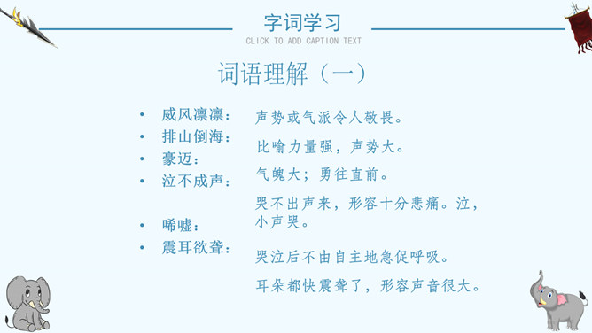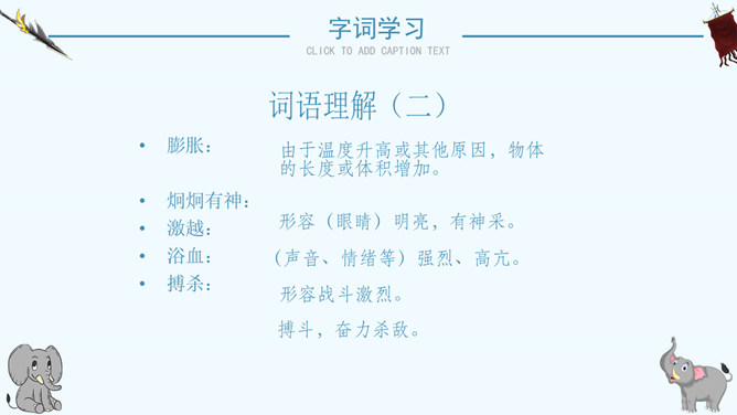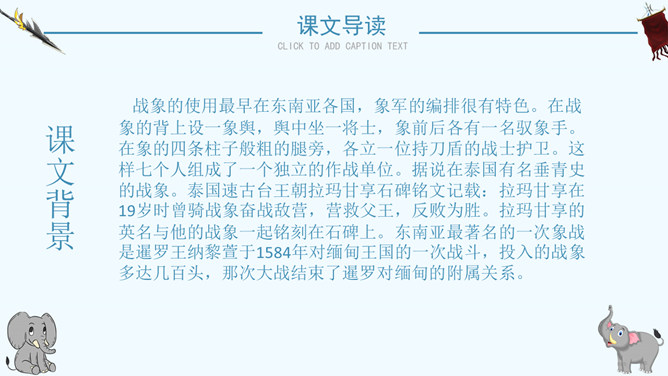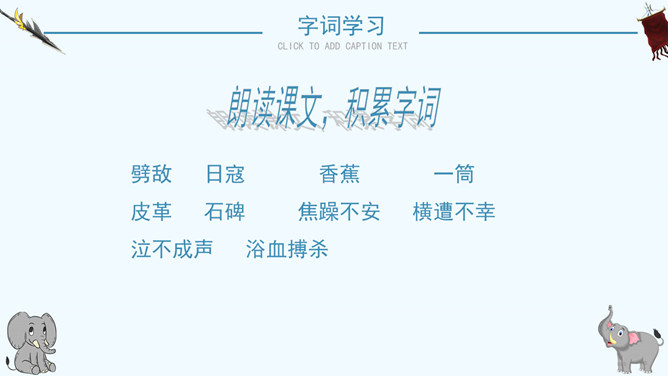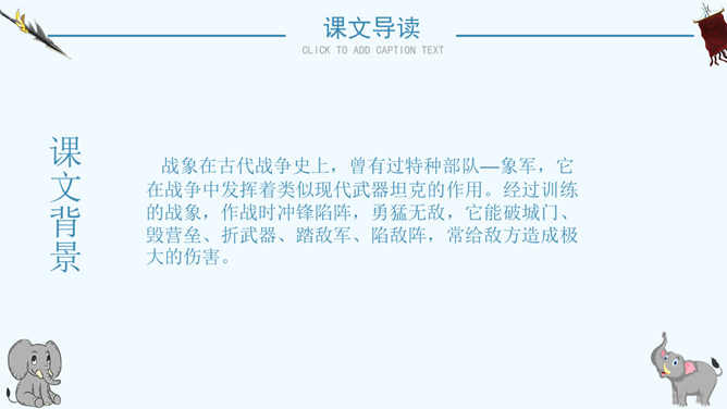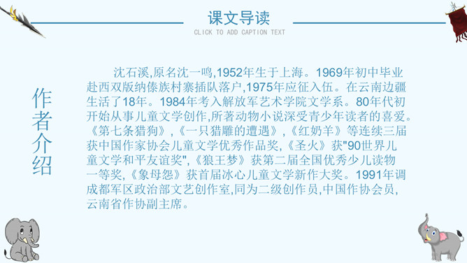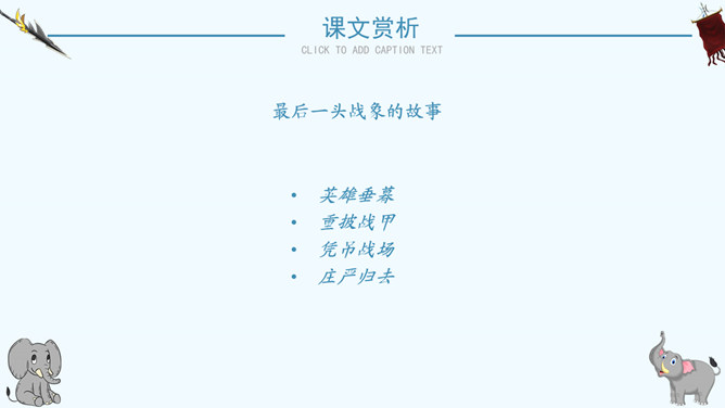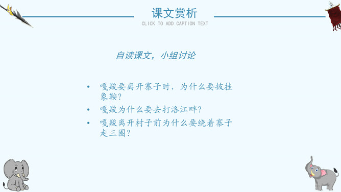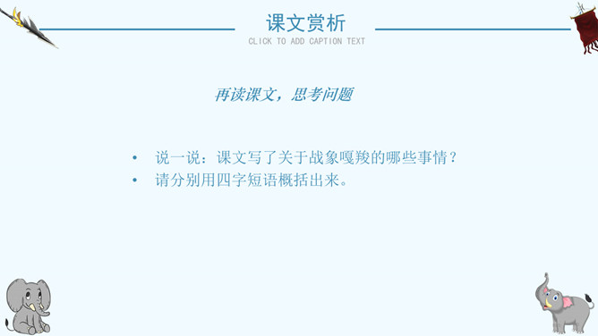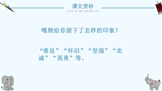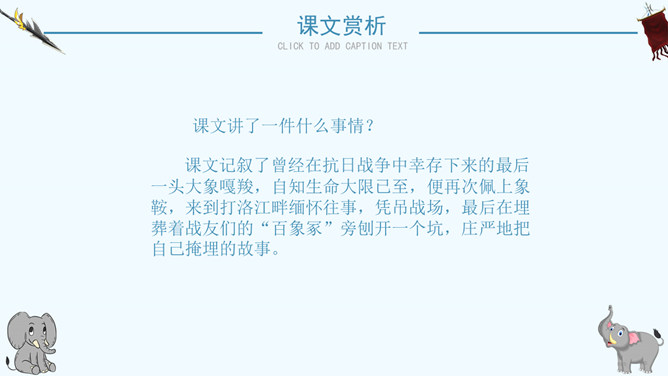 读了课题你想知道文章都写了些什么吗?阅读课文后你有什么感想 ?预感死亡,寻找象鞍,绕寨三圈,怀念战友,自掘象冢。再读课文,思考问题:说一说:课文写了关于战象嘎羧的哪些事情?请分别用四字短语概括出来。课文讲了一件什么事情?课文记叙了曾经在抗日战争中幸存下来的最后一头大象嘎羧,自知生命大限已至,便再次佩上象鞍,来到打洛江畔缅怀往事,凭吊战场,最后在埋葬着战友们的“百象冢”旁刨开一个坑,庄严地把自己掩埋的故事。自读课文,小组讨论:嘎羧要离开寨子时,为什么要披挂象鞍?嘎羧为什么要去打洛江畔?嘎羧离开村子前为什么要绕着寨子走三圈?嘎羧给你留下了怎样的印象?“善良”“怀旧”“坚强”“忠诚”“英勇”等。