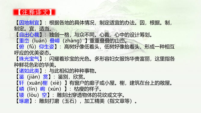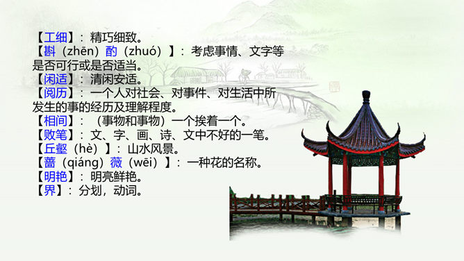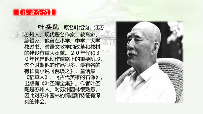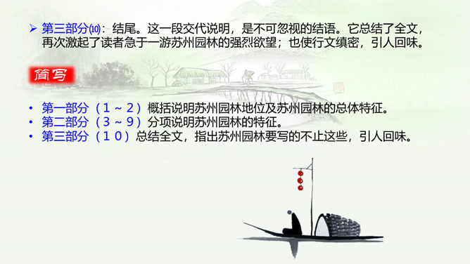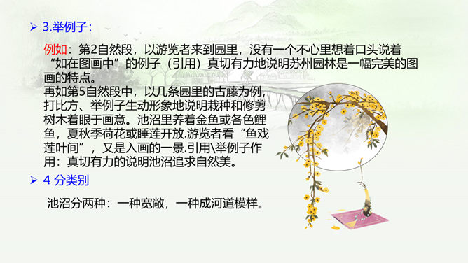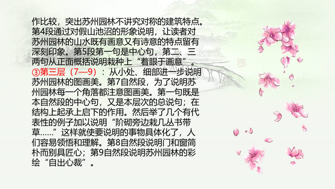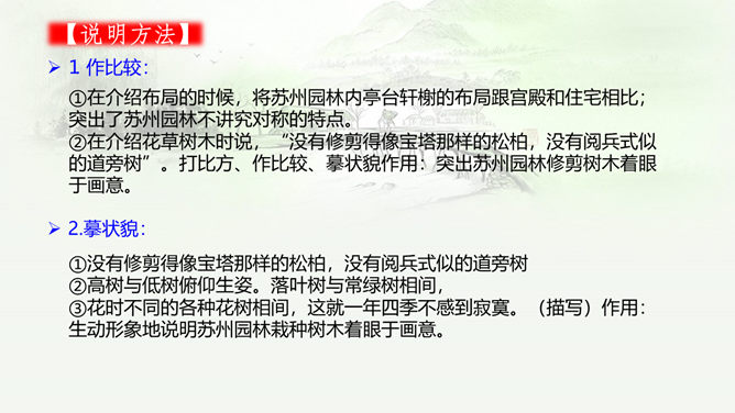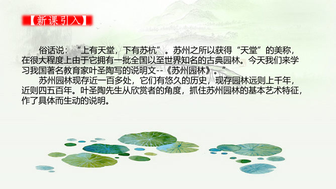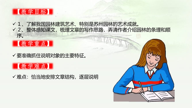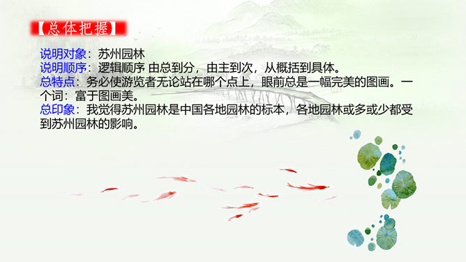 教学目标:1、了解我国园林建筑艺术、特别是苏州园林的艺术成就。2、整体感知课文,梳理文章的写作思路,弄清作者介绍园林的条理和顺序。教学重点:要准确抓住说明对象的主要特征。教学难点:难点:恰当地安排文章结构,逐层说明。复习说明文的文体知识:1、常见的说明顺序有哪些?答:常见的说明顺序有:时间顺序、空间顺序、逻辑顺序。2、说明文常见的说明方法有哪些?答:说明方法很多,常见的有:分类别、下定义、举例子、作比较、列数字、打比方、列图表等。3、说明文语言有哪些特点?答:说明文的语言特点:准确、简练、平实、生动等。揣摩下列句子中加点的词语,回答问题。倘若要我说说总的印象,我觉得苏州园林是中国各地园林的标本。(“标本”在这里是什么意思?)假山的堆叠,可以说是一项艺术而不仅是技术。(“艺术”与“技术”有什么区别?)所属专题:苏州园林ppt。