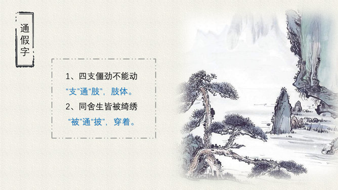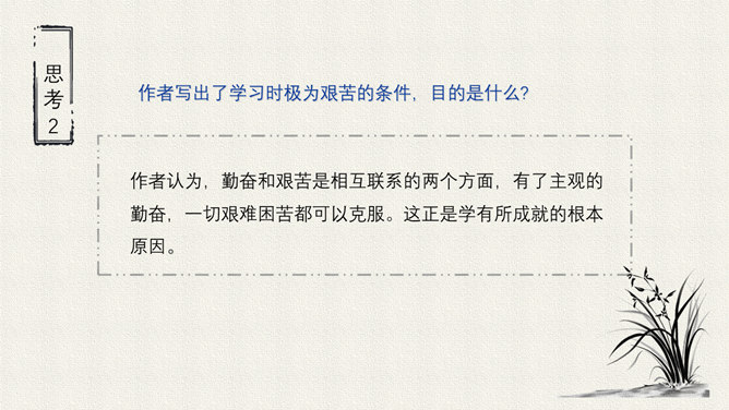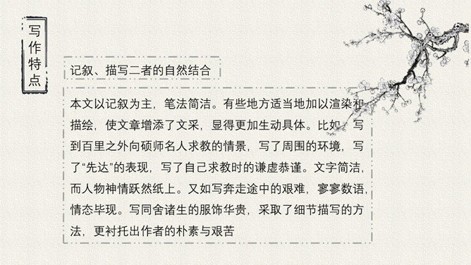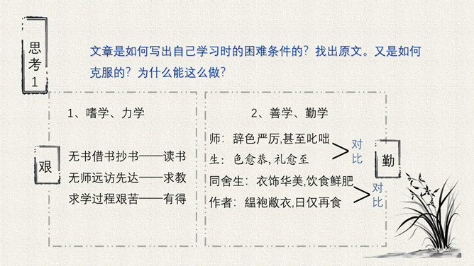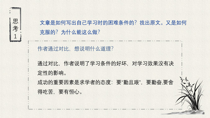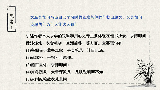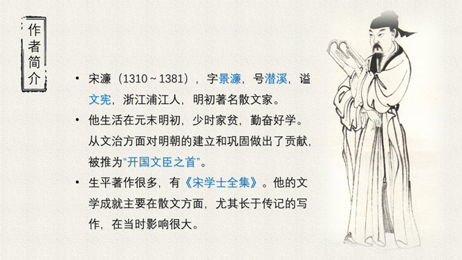 宋濂(1310~1381),字景濂,号潜溪,谥文宪,浙江浦江人,明初著名散文家。生平著作很多,有《宋学士全集》。他的文学成就主要在散文方面,尤其长于传记的写作,在当时影响很大。1、四支僵劲不能动“支”通“肢”,肢体。2、同舍生皆被绮绣“被”通“披”,穿着。文章是如何写出自己学习时的困难条件的?找出原文。又是如何克服的?为什么能这么做?讲述作者本人求学的艰难和用心之专主要体现在借书抄录,求师叩问,跋涉艰难,衣食粗劣,生活简朴,等方面。主要语句有(1)每假借于藏书之家,手自笔录,计日以还。(2)砚冰坚,手指不可屈伸。 (3)趋百里外,求师叩问;(4)穷冬烈风,大雪深数尺,足肤皲裂而不知。 (5)余则纭袍敝衣处其间。作者通过对比,想说明什么道理?通过对比,作者说明了学习条件的好坏,对学习效果没有决定性的影响。成功的重要因素是求学者的态度:要“勤且艰”,要勤奋,要舍得吃苦,要有恒心。所属专题:送东阳马生序ppt。