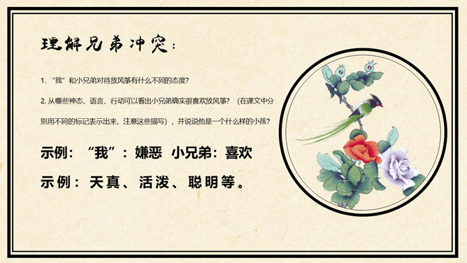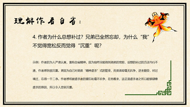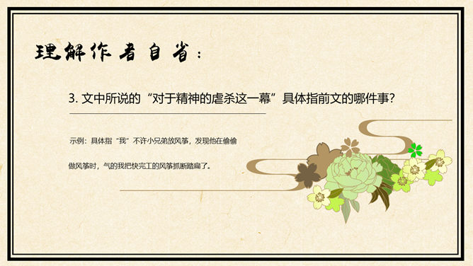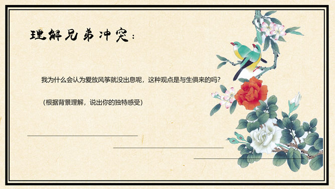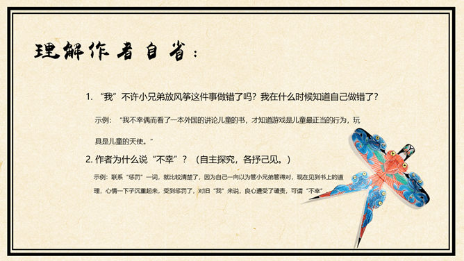 听录音,在听读过程中勾画出疑难字词,难懂句子。采用你最喜欢的方式诵读课文并思考问题:①这篇课文记叙了一件什么事?用简洁的语言概括。②读完课文你最大感受(从感情角度)是什么?(用词语表示)合作交流 :进一步画出课文中还有哪些不理解的地方,以学习小组为单位,在小组内交流讨论,合作探究,同时记录解决不了的问题,在下节课班内交流。理解兄弟冲突:1. “我”和小兄弟对待放风筝有什么不同的态度?2. 从哪些神态、语言、行动可以看出小兄弟确实很喜欢放风筝?(在课文中分别用不同的标记表示出来,注意这些描写),并说说他是一个什么样的小孩?我为什么会认为爱放风筝就没出息呢,这种观点是与生俱来的吗?(根据背景理解,说出你的独特感受)1. “我”不许小兄弟放风筝这件事做错了吗?我在什么时候知道自己做错了?示例:“我不幸偶而看了一本外国的讲论儿童的书,才知道游戏是儿童最正当的行为,玩具是儿童的天使。” 2. 作者为什么说“不幸”?(自主探究,各抒己见。)示例:联系“惩罚”一词,就比较清楚了,因为自己一向以为管小兄弟管得对,现在见到书上的道理,心情一下子沉重起来,受到惩罚了,对旧“我”来说,良心遭受了谴责,可谓“不幸”。