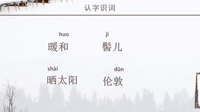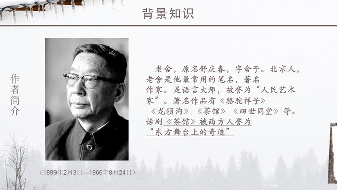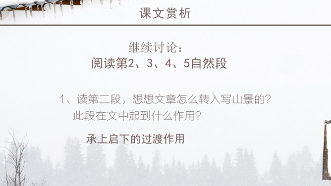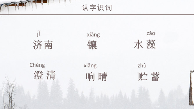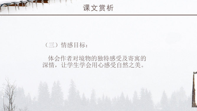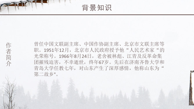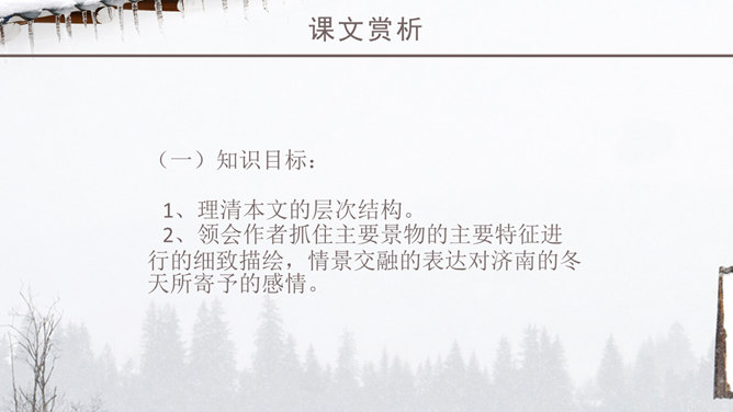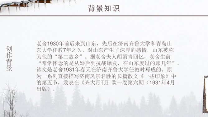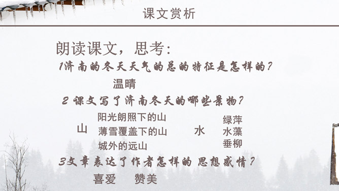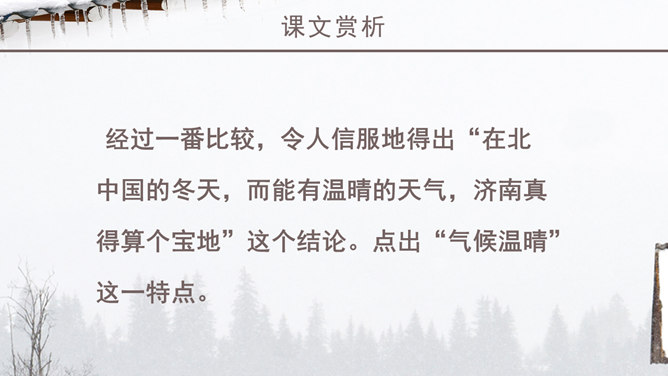 老舍一反以往厚重、富有沧桑感的现实主义风格,以轻快、自然的笔调描绘了一块冬天里的宝地。该文的主题思想即对济南特有的冬景的喜爱和赞美。作者多用温情的意象来描绘济南冬天温晴之景,营造出一种温婉的整体性语感。通过对济南冬天场景的描述,充分体现了作者对济南的冬天的喜爱之情,对济南这座城市的热爱之情,以及作者热爱大自然,热爱生活,热爱生命的生活情操。语言层面写的是济南的“温晴”,所要表达的是济南冬天的温情 :“温晴”是所见的外象 ,是借以表现心象的客体和媒介 ;“温情”是心象 ,它蕴涵的是作家的主观情感、生命和人生感悟及审美感受。文章不惜笔墨写景,实际是抒发对济南冬天的喜爱、赞美之情,这才真正是文章的意蕴、文章的核心。所属专题:济南的冬天ppt。
