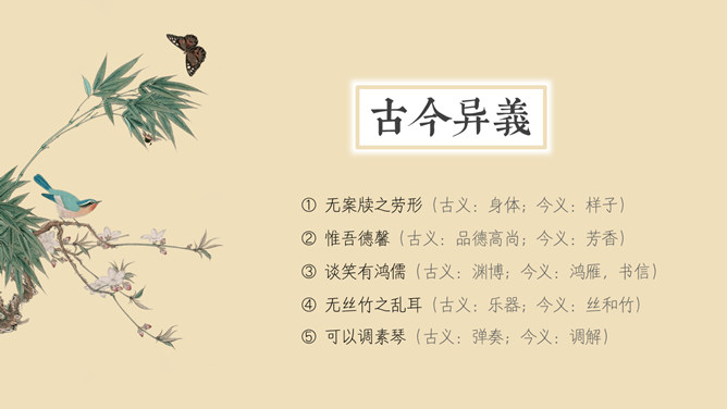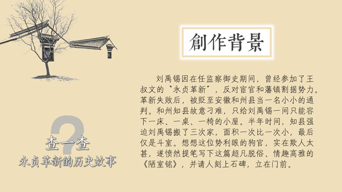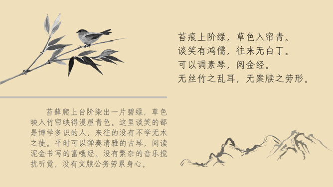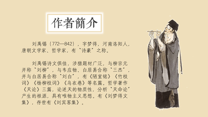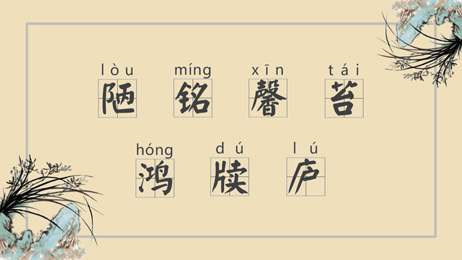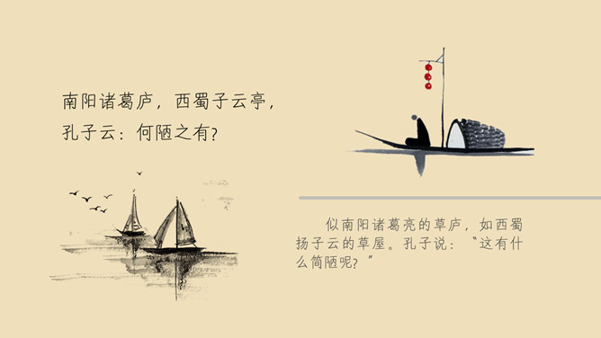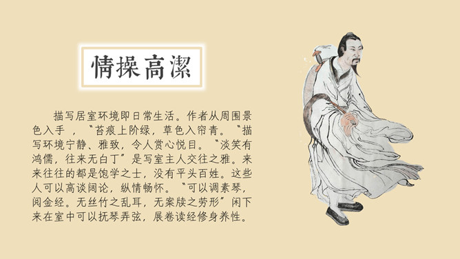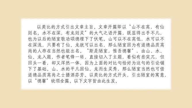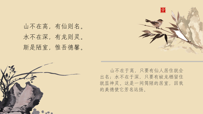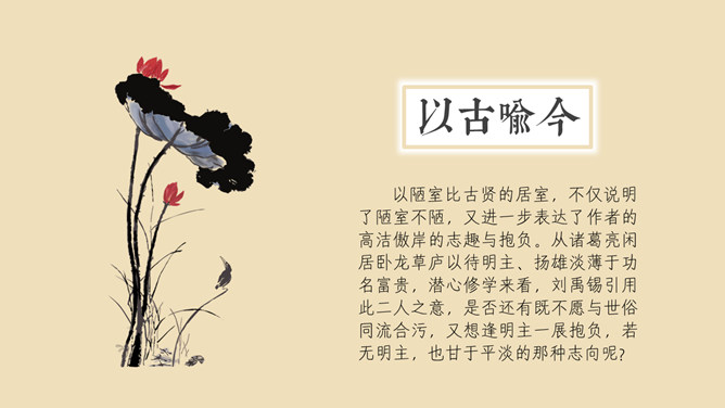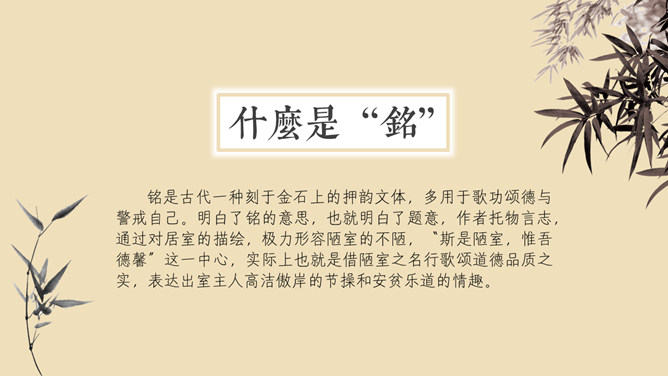 铭是古代一种刻于金石上的押韵文体,多用于歌功颂德与警戒自己。以类比的方式引出文章主旨。文章开篇即以“山不在高,有仙则名。水不在深,有龙则灵”的大气之语开篇,既显得出手不凡,也为以后的陋室歌功颂德埋下了伏笔。本文在写作上的特点是巧妙地运用比兴手法,含蓄地表达主题,开头四句既是比,又是兴,言山水引出陋室,言仙、龙引出德馨,言名、灵暗喻陋室不陋。用南阳诸葛庐、西蜀子云亭类比陋室,表达了作者政治、文学的两大理想,最后引孔子的话作结又暗含“君子居之”的深意。你的房间都有什么特点试着向大家描述一下。托物言志,安贫乐道的情趣,高洁傲岸的节操。所属专题:陋室铭ppt。
