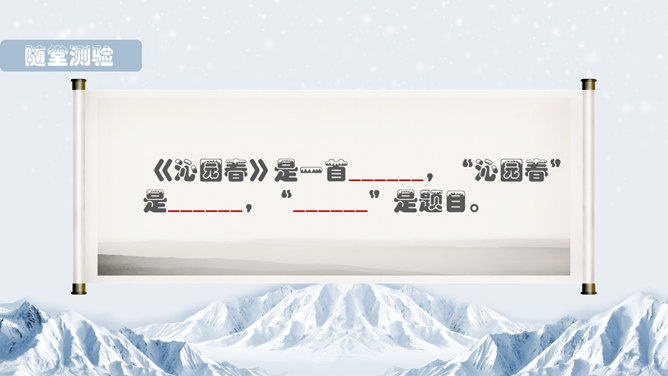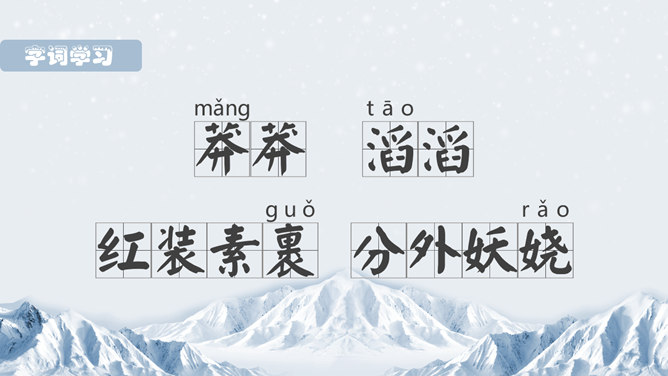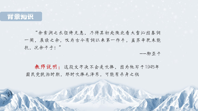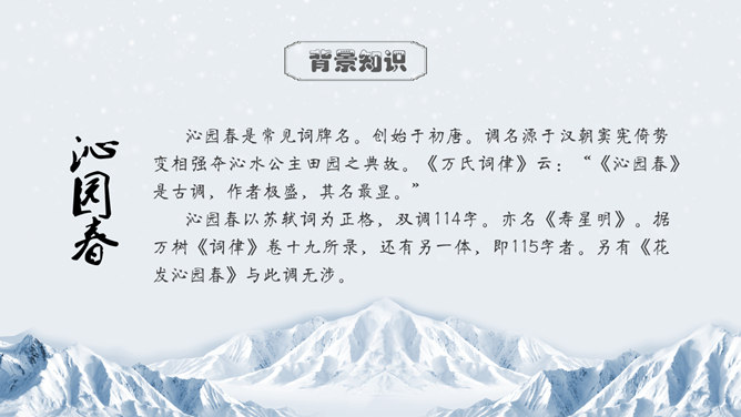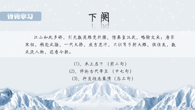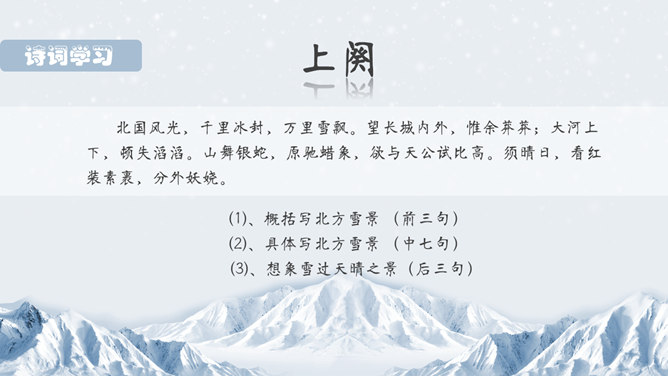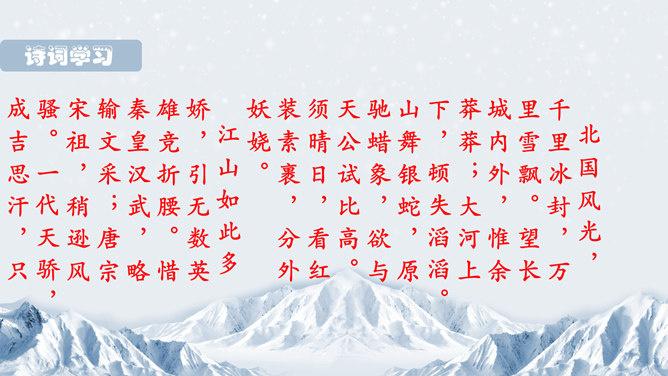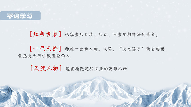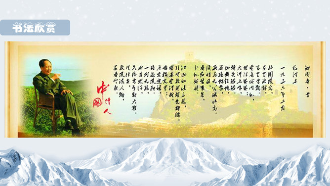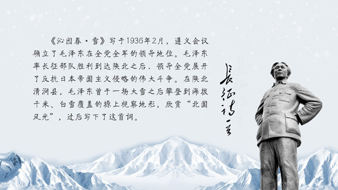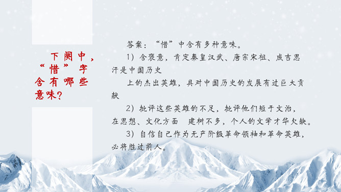 沁园春以苏轼词为正格,双调114字。亦名《寿星明》。据万树《词律》卷十九所录,还有另一体,即115字者。另有《花发沁园春》与此调无涉。《沁园春·雪》写于1936年2月,遵义会议确立了毛泽东在全党全军的领导地位。毛泽东率长征部队胜利到达陕北之后.领导全党展开了反抗日本帝国主义侵略的伟大斗争。[红装素裹]形容雪后天晴,红日、白雪交相辉映的景象。[风流人物]这里指能建功立业的英雄人物。[一代天骄]称雄一世的人物。天骄,“天之骄子”的省略语, 意思是天所娇纵宠爱的人。下阕中,“惜”字含有哪些意味?答案:“惜”中含有多种意味。1)含褒意,肯定秦皇汉武、唐宗宋祖、成吉思汗是中国历史上的杰出英雄,具对中国历史的发展有过巨大贡献。2)批评这些英雄的不足,批评他们短于文治,在思想、文化方面 建树不多,个人的文学才华欠缺。3)自信自己作为无产阶级革命领袖和革命英雄,必将胜过前人。所属专题:沁园春雪ppt。
