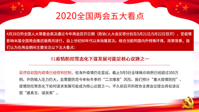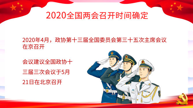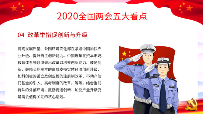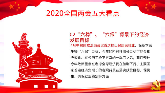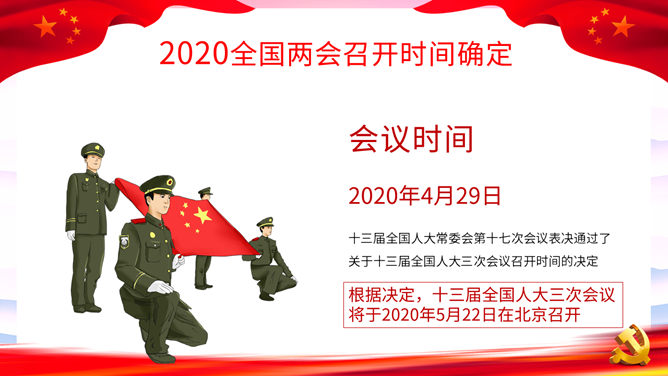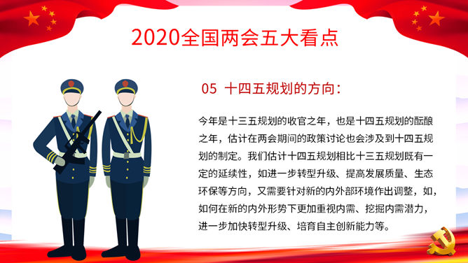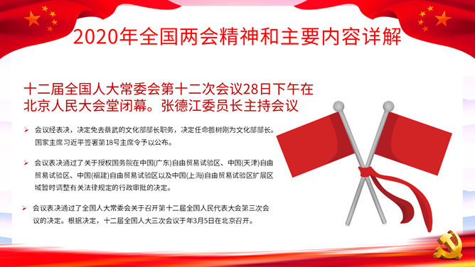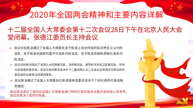 两会报告解读PPT模板。一套2020年两会主题幻灯片模板,包括两会基本概述、两会五大看点、全国两会精神和主要内容详解等内容。