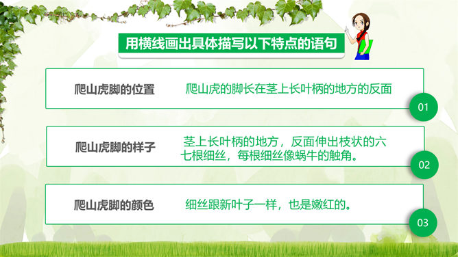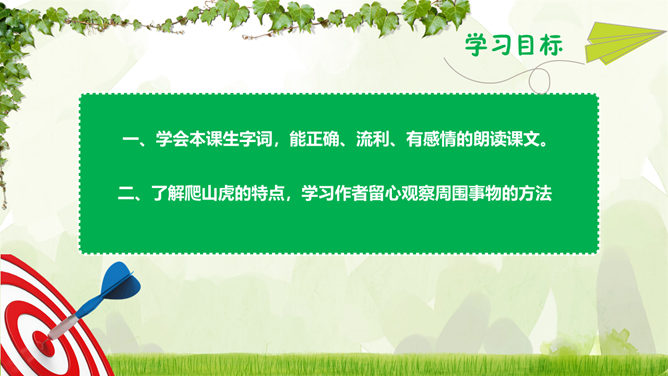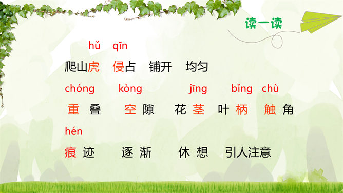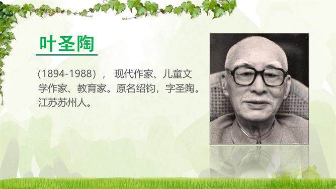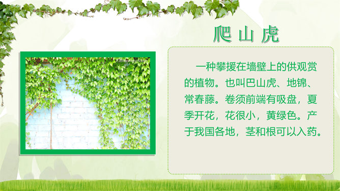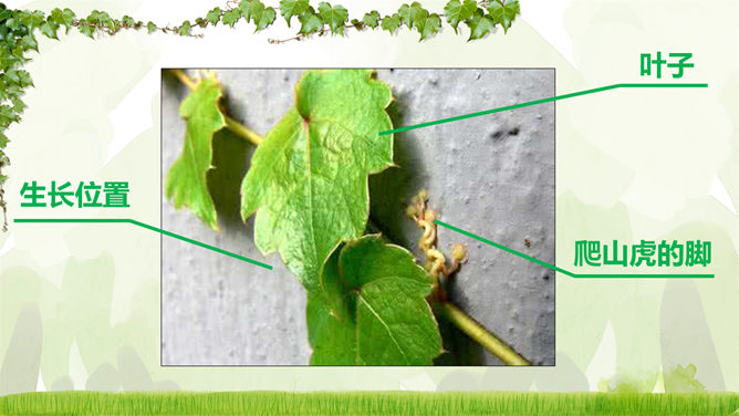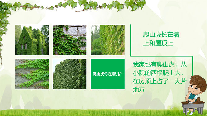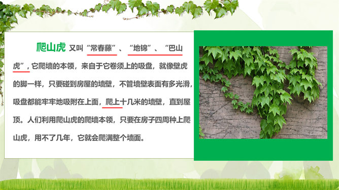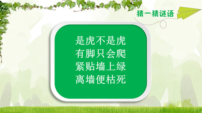 猜一猜谜语:是虎不是虎,有脚只会爬,紧贴墙上绿,离墙便枯死。学习目标:一、学会本课生字词,能正确、流利、有感情的朗读课文。二、了解爬山虎的特点,学习作者留心观察周围事物的方法。种丝瓜和葡萄,都要搭架子。不搭架子,丝瓜和葡萄就不能往高处生长。 上搭架,下搭架,条条青龙藤上挂。上搭架,下搭架,串串珍珠藤上挂。一种攀援在墙壁上的供观赏的植物。也叫巴山虎、地锦、常春藤。卷须前端有吸盘,夏季开花,花很小,黄绿色。产于我国各地,茎和根可以入药。叶圣陶,(1894-1988), 现代作家、儿童文学作家、教育家。原名绍钧,字圣陶。江苏苏州人。爬山虎长在墙上和屋顶上。我家也有爬山虎,从小院的西墙爬上去,在房顶上占了一大片地方。所属专题:爬山虎的脚ppt。