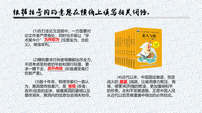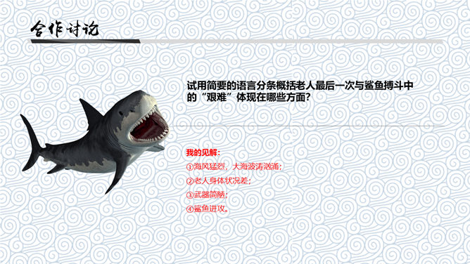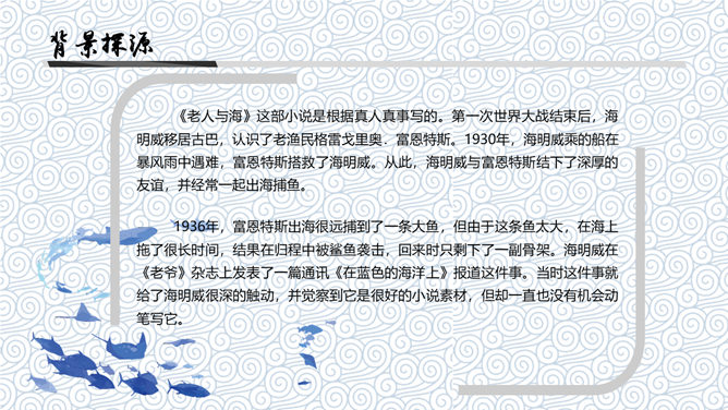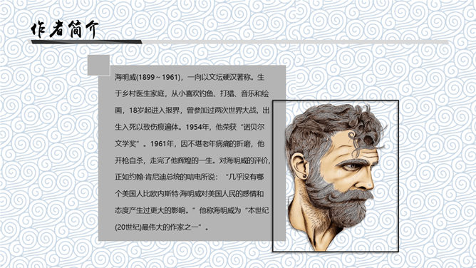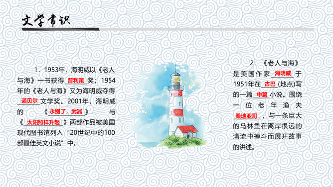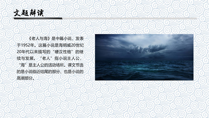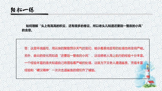 《老人与海》是中篇小说,发表于1952年。这篇小说是海明威20世纪20年代以来描写的“硬汉性格”的继续与发展。“老人”指小说主人公,“海”是主人公的活动场所。课文节选的是小说临近结尾的部分,也是小说的高潮部分。海明威(1899~1961),一向以文坛硬汉著称。生于乡村医生家庭,从小喜欢钓鱼、打猎、音乐和绘画,18岁起进入报界,曾参加过两次世界大战,出生入死以致伤痕遍体。1954年,他荣获“诺贝尔文学奖”。如何理解“头上有高高的积云,还有很多的卷云,所以老头儿知道还要刮一整夜的小风”的含意。答:这是环境描写,用云块的聚散预示天气的变幻,暗示着桑地亚哥的处境也将变得严峻。另外,由云的变化而知道“还要刮一整夜的小风”,这说明老人海上航行的经验十分丰富。一个经验丰富的渔夫知道自己将面临着严峻的处境,这就为下文老人遭遇鲨鱼,凭借丰富经验和“硬汉精神”一次次击退鲨鱼的侵犯作了铺垫。