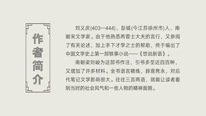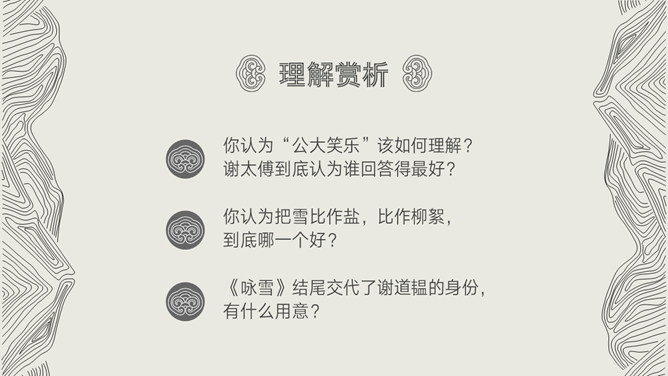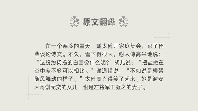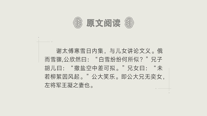 《世说新语》原为8卷,今本作3卷,分德行、言语、政事、文学、方正、雅量、识鉴、赏誉等36门。主要记晋代士大夫的言行、形式,较多地反映了当时士族的思想、生活和清谈放诞的作风。特殊句识记,倒装句:白雪纷纷何所似?省略句:①(兄女)即公大兄无奕女。②(君)日中不至。理解赏析,你认为“公大笑乐”该如何理解?谢太傅到底认为谁回答得最好? 你认为把雪比作盐,比作柳絮,到底哪一个好?《咏雪》结尾交代了谢道韫的身份,有什么用意?理解赏析,元方义正辞严地指出了父亲朋友的哪两点错误? 元方是一个怎样的孩子呢?从这则故事中,我们得到什么启示?选择5个事物用比喻的修辞手法写5个句子。你能否再举几例古人咏雪的诗句么。元方“入门不顾”是否失礼谈谈你的看法,写到日记中。